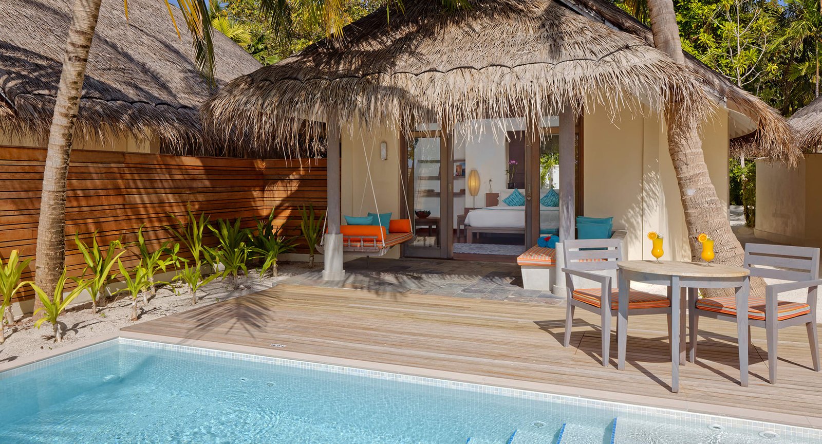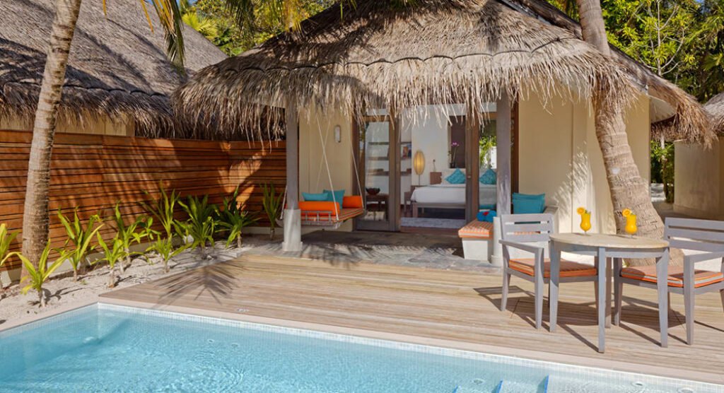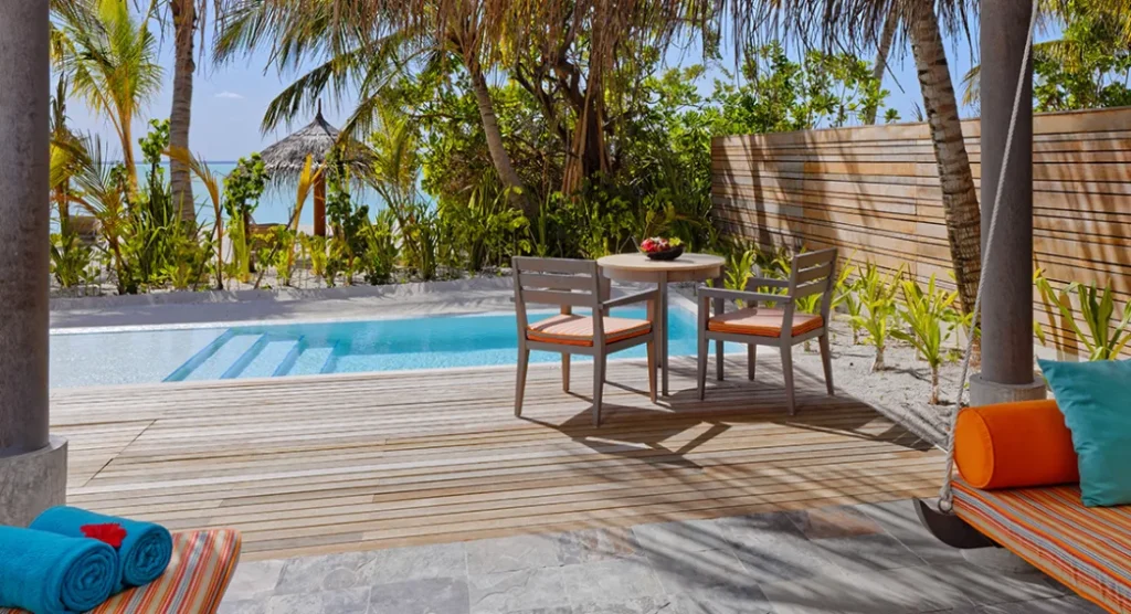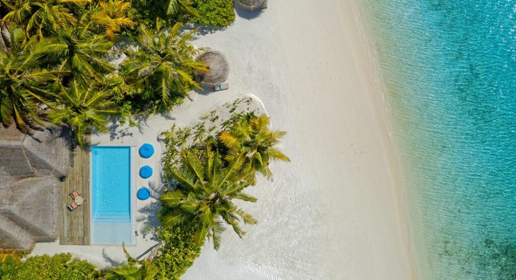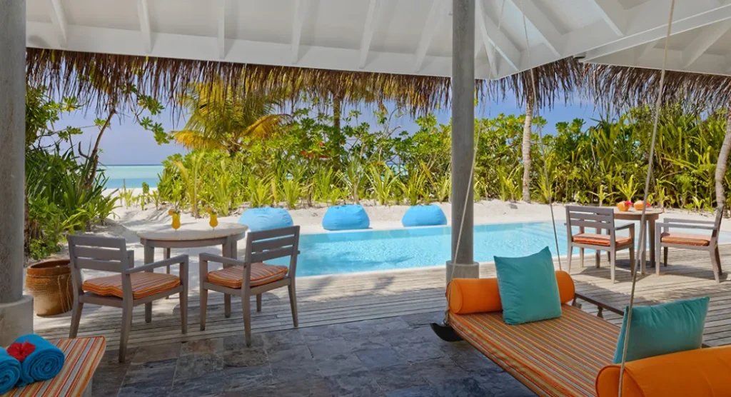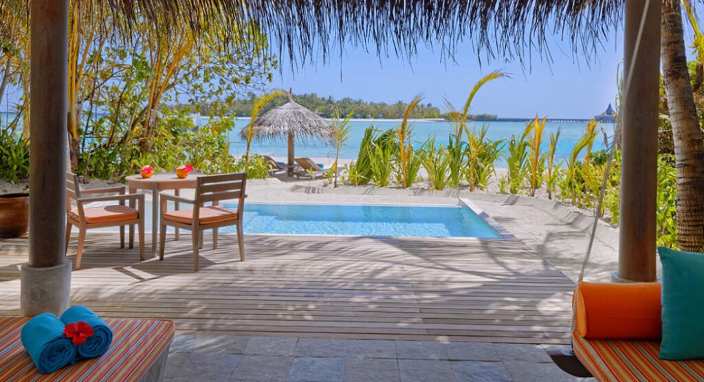 استمتع بإقامة فاخرة على الشاطئ مع إطلالات خلابة على شروق الشمس ومسبح خاص بطول 5.8 أمتار غارق في الرمال البيضاء الناعمة، فيما تفصلك خطوات قليلة فقط عن مياه المحيط الهندي الفيروزية. دلّل نفسك بلحظات استرخاء على السرير النهاري الممتد فوق حافة المسبح أو تحت أشعة الشمس على التراس المزود بكراسي استلقاء ومنطقة طعام خارجية. وبخدمة مضيف الفيلا الخاص، ستجد كل ما تحتاجه لتجربة عائلية مثالية في أحد أجمل منتجعات المالديف.