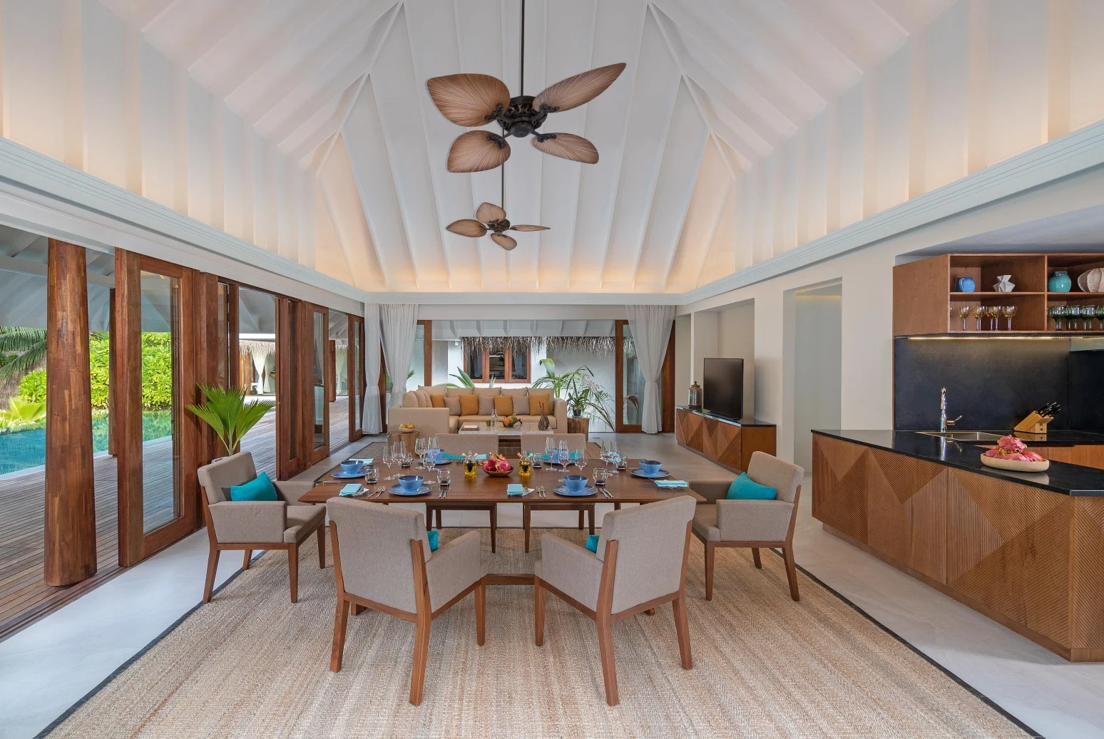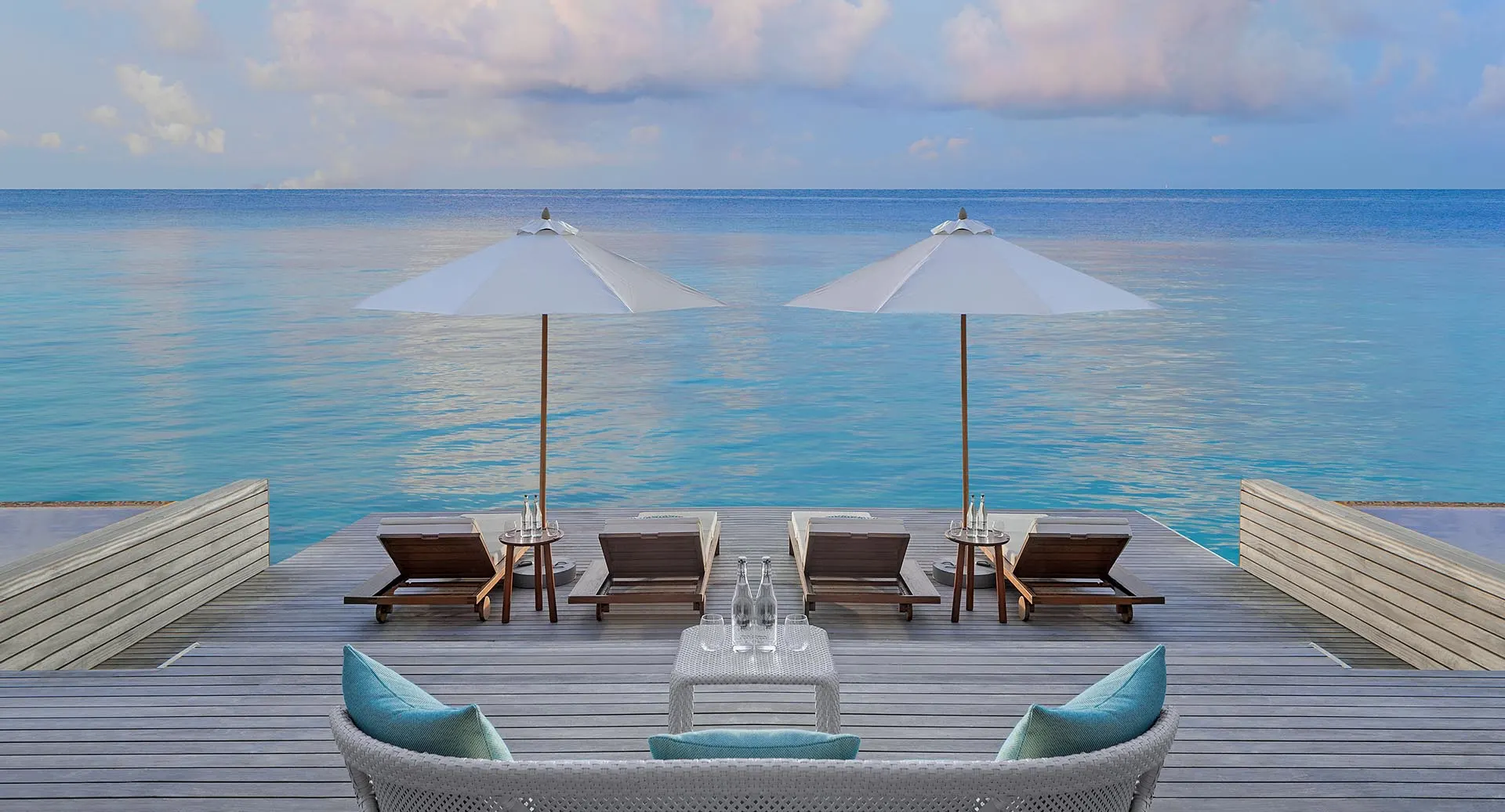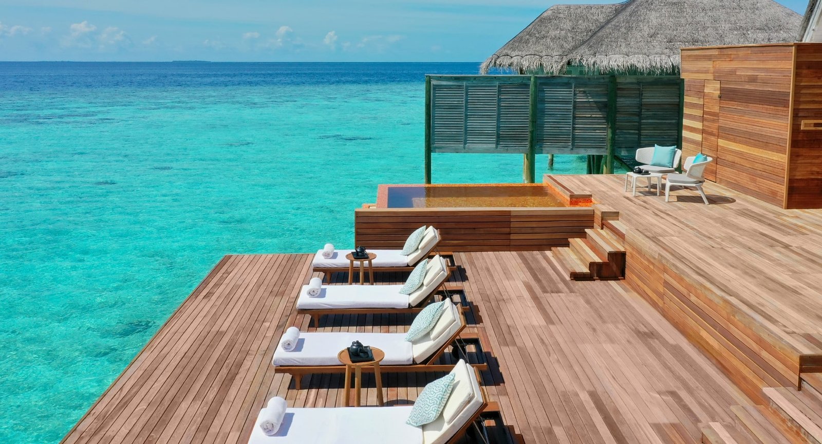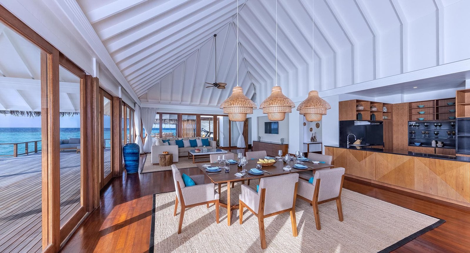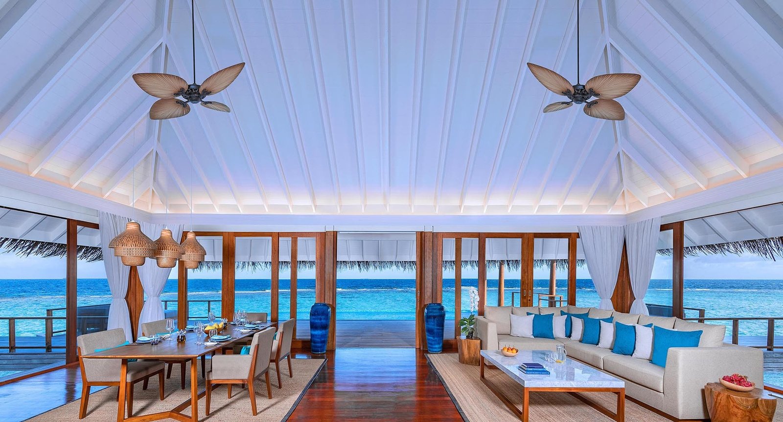 تقع هذه الإقامة الفاخرة في نهاية الممر الخشبي مباشرة، لتمنحكم إطلالات بانورامية ساحرة على المحيط المفتوح. ومع وجود جناحين مستقلين يضمان غرف نوم بحمامات داخلية في كلا الطرفين، ولكل منهما مساحة معيشة خارجية خاصة، يمكنكم الاستمتاع بلحظات حميمية خاصة أو مشاركة أوقات لا تُنسى مع أحبائكم.