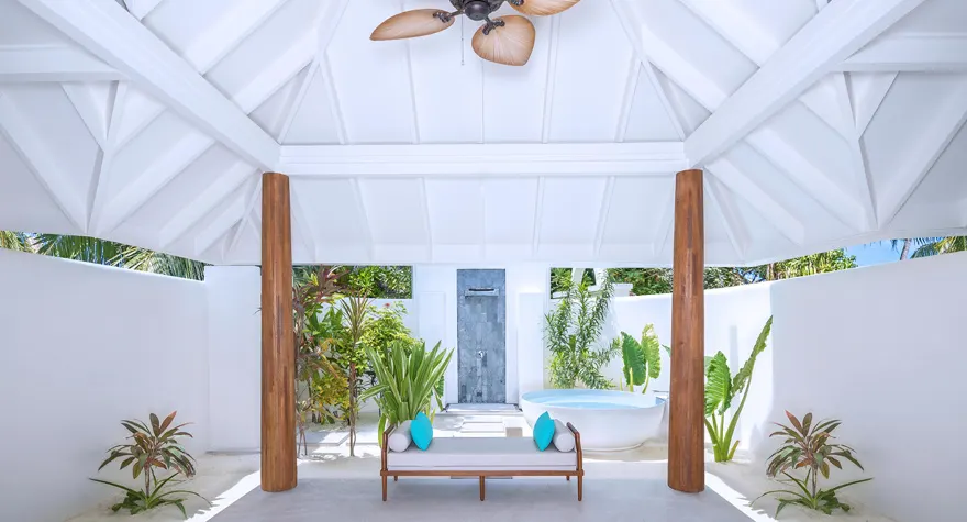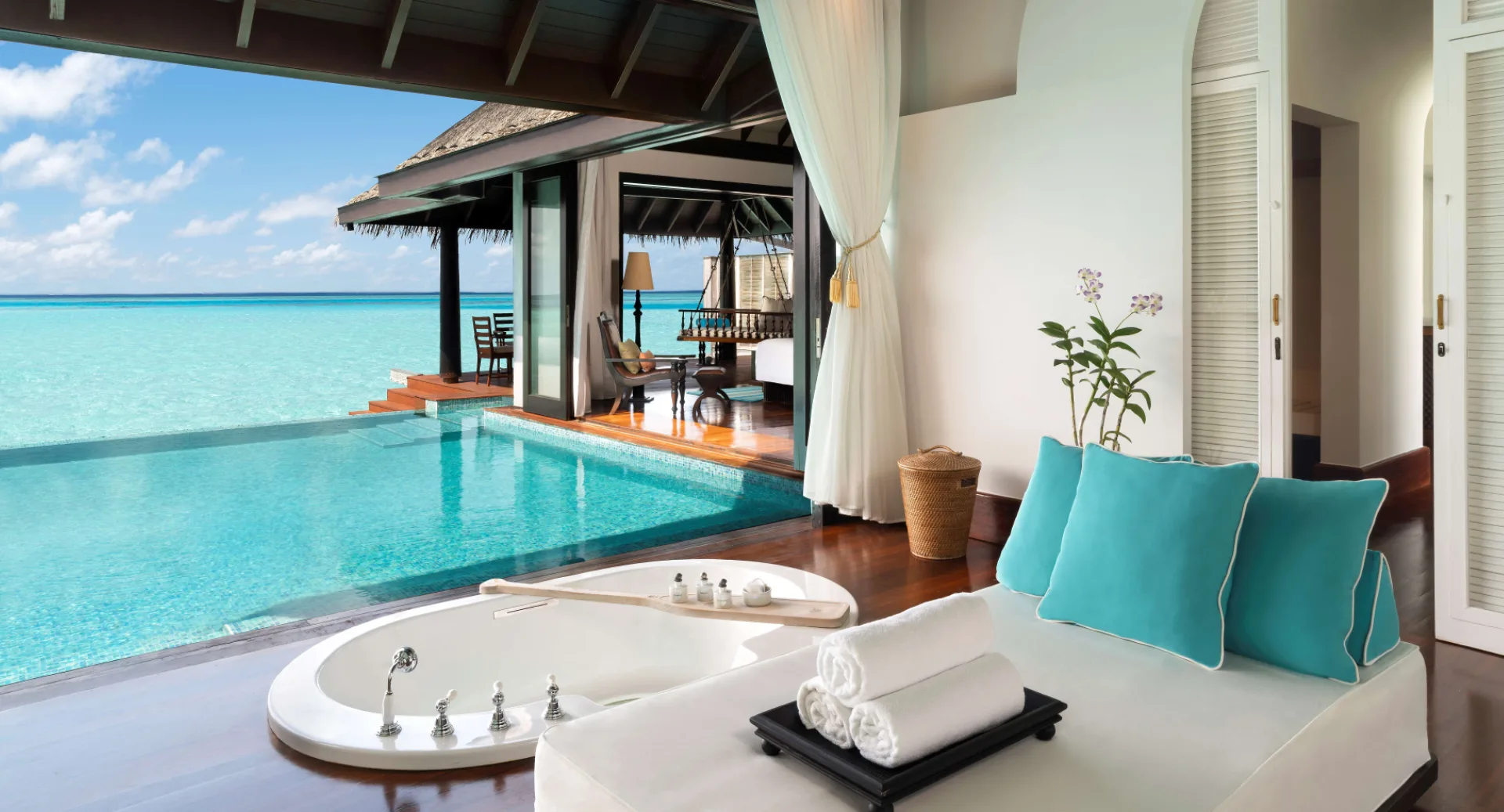 يمكن للنزلاء الاختباء في زاويتهم الخاصة من الجنة، على بعد خطوات من الشاطئ الرملي أو مباشرة فوق المياه الفيروزية. يمكنهم السباحة في المسبح الخاص، أو الاسترخاء على أرجوحة نهارية، أو مشاهدة غروب الشمس المذهل.
