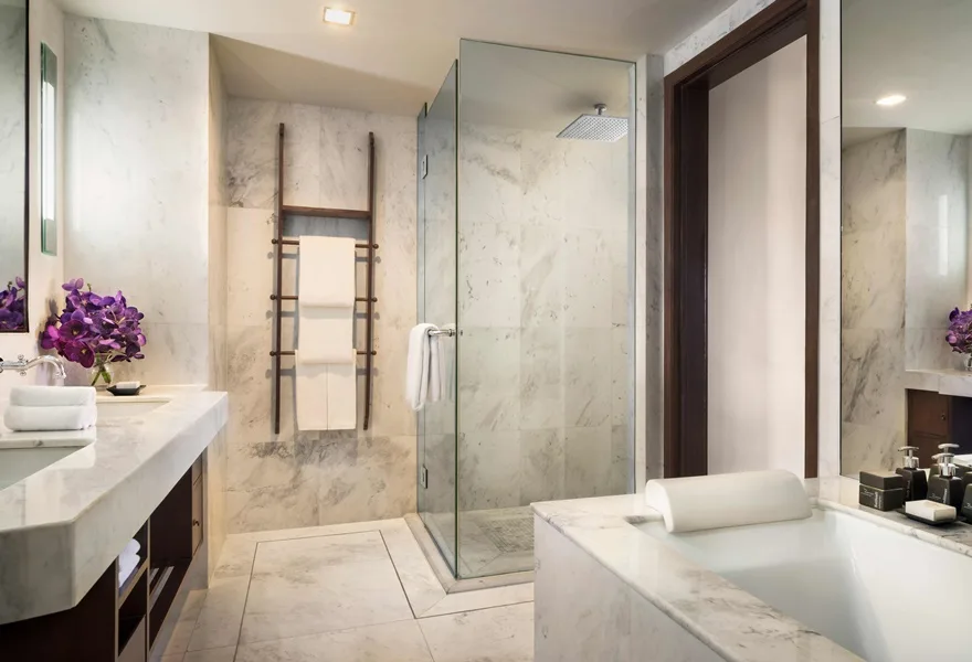 استرخِ في غرفة نوم أنيقة ذات إطلالات نابضة بالحياة على المدينة، وانعم بالراحة في حمّام عصري بتصميم من الرخام الفاخر يمنح إحساسًا بالانتعاش والنقاء. تجمع الغرفة بين أرضيات خشب الماكا الصلب ولمسات الحرير التايلاندي الفاخر التي تضيف دفئًا وأناقة، فيما تعكس عناصر الديكور التجريدي روح الثقافة التايلاندية بأسلوب راقٍ يعبر عن الفخامة والذوق الرفيع.