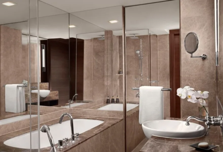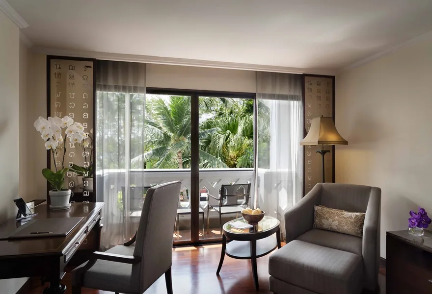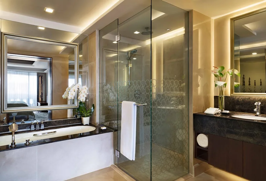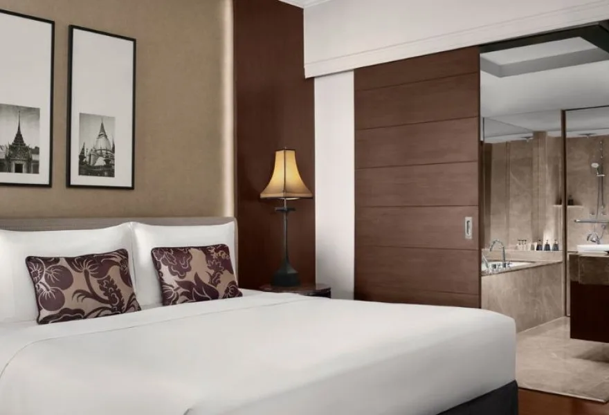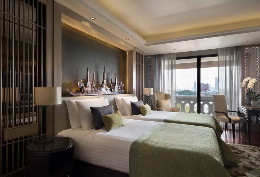 استمتع بأجواء الفخامة والراحة في جناحك المزود بشرفة خاصة ونوافذ تمتد من الأرض حتى السقف، حيث تجسّد الزخارف التايلاندية روح هذا الملاذ الراقي على ضفاف النهر بأسلوب عصري أنيق. تنعكس اللمسات التايلاندية التقليدية في تصميم اللوح الخلفي المضيء للسرير والمستوحى من النقوش القديمة المنقوشة بعناية. يتميز الجناح بسقوف عالية مع إضاءة ناعمة وأثاث أنيق يضم أريكة ومكتب كتابة يتيح لك العمل براحة تامة من داخل جناحك. أما الحمّام الفخم بأرضياته الرخامية فيوفر مساحة رحبة ومرافق فاخرة، سواء كنت مسافرًا بمفردك أو بصحبة شريكك.