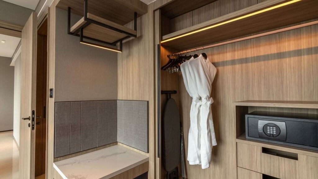 كما تحتوي على مساحة مخصصة للأمتعة والملابس، ومكتب عمل أنيق، وخزنة إلكترونية.