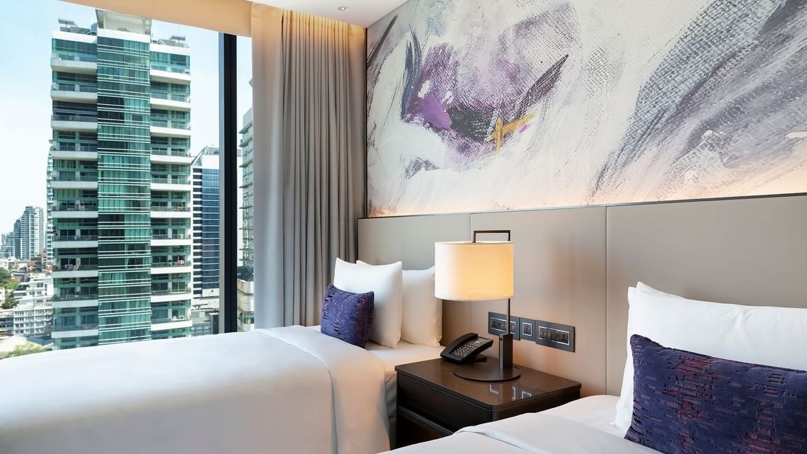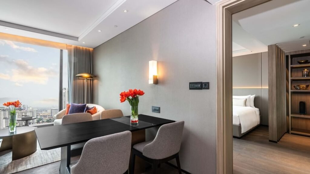 يقع جناح الديلوكس بغرفتي نوم في الطابق 29، ويوفر إطلالات مذهلة على وسط مدينة بانكوك وما بعدها. يتميز الجناح بمساحته الرحبة التي تضم غرفة معيشة أنيقة، وغرفة طعام مستقلة مزوّدة بمطبخ صغير، وغرفة نوم رئيسية بسرير ملكي مع مرتبة Sealy Posturepedic، بالإضافة إلى غرفة تبديل ملابس فسيحة.