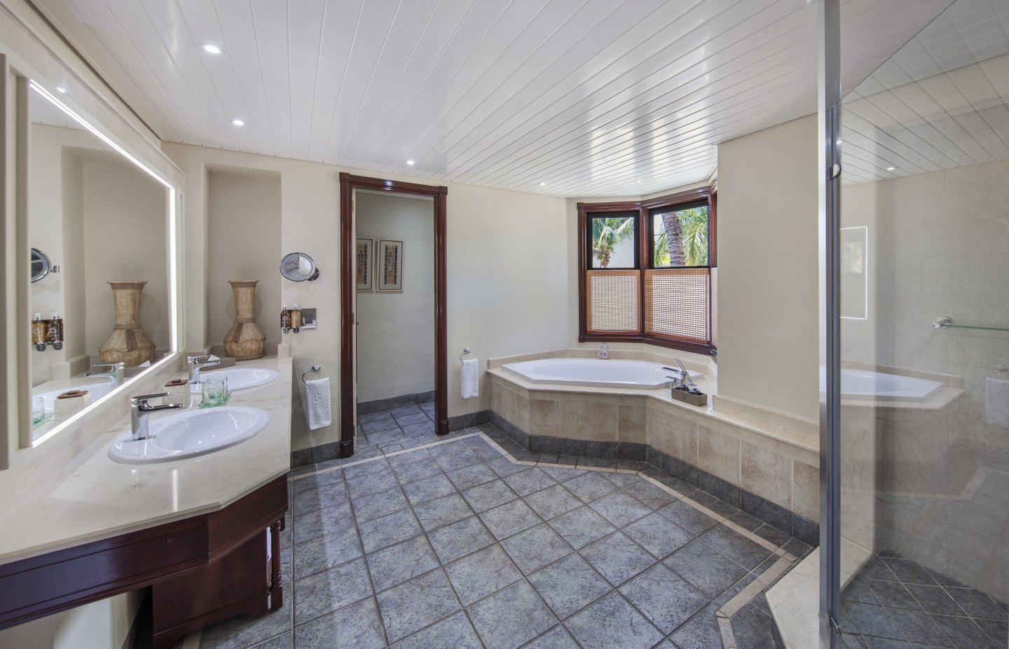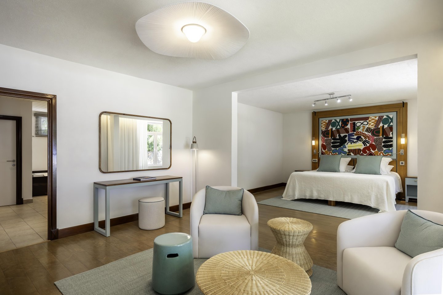 وسط الحدائق الاستوائية الغنّاء، يقدم هذا الجناح ملاذًا فاخرًا يلبي احتياجات جميع أفراد العائلة. يمكن للوالدين والأطفال الاستمتاع بمساحات رحبة لقضاء أوقات ممتعة معًا أو للاسترخاء بهدوء. الشرفة، المجهزة بأثاث خارجي فاخر وكراسي استرخاء موضوعة في ظل الحديقة شبه الخاصة، تمنح تجربة مثالية للمعيشة في الهواء الطلق بأقصى درجات الراحة. يضفي الخشب الداكن لمسة من الأناقة على غرفة النوم الرئيسية ذات الطراز الكولونيالي، فيما تضيف الإضاءة الدافئة والدرجات الترابية العميقة إحساسًا رومانسيًا متكاملًا. يستمر هذا الجو الهادئ في الحمام الفاخر الذي يضم خزانة واسعة. ومن خلال باب أنيق وخاص، يمكن الوصول إلى غرفة الأطفال المصممة بعناية لتلبي راحتهم.