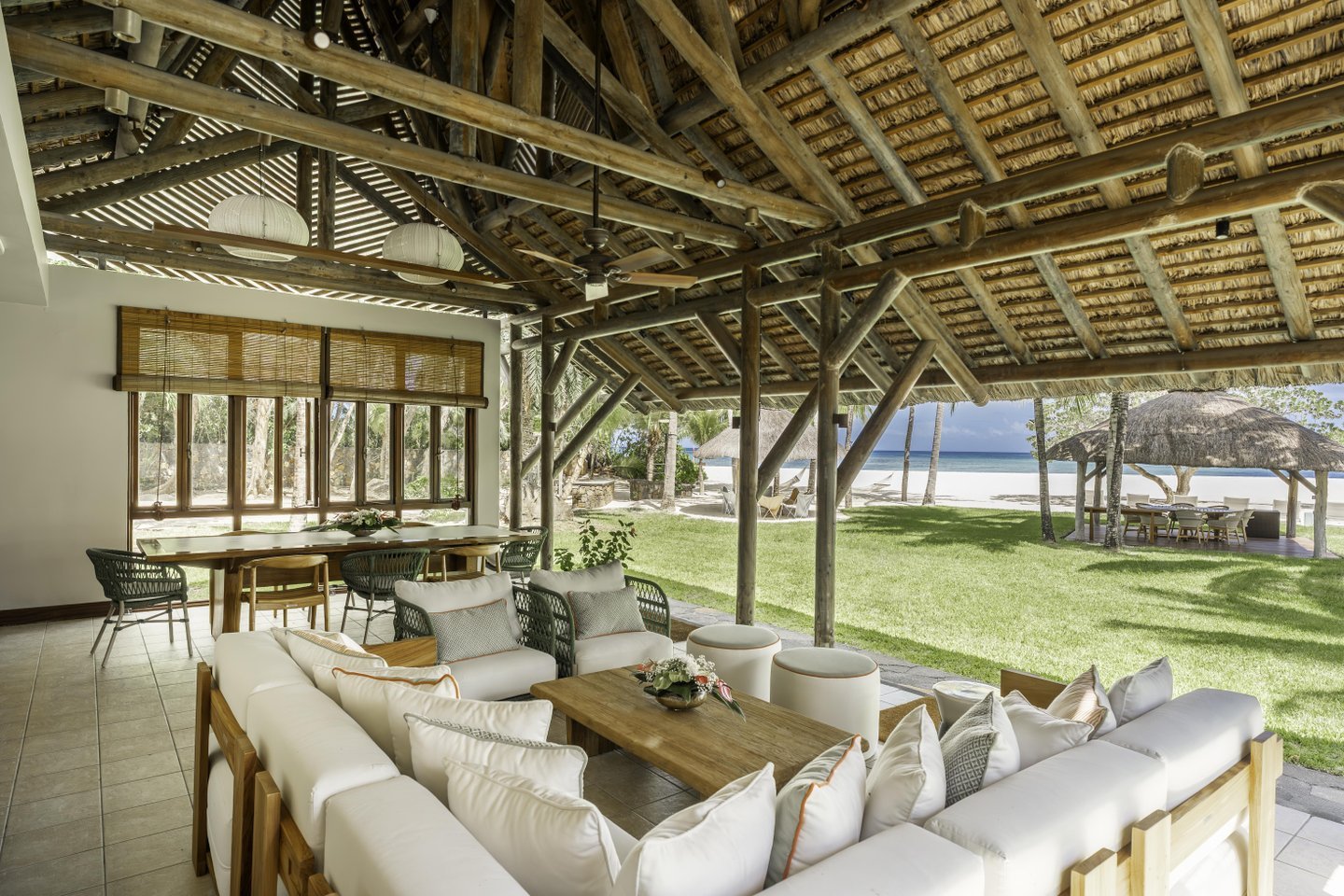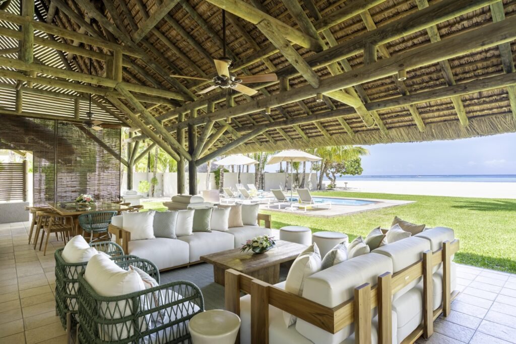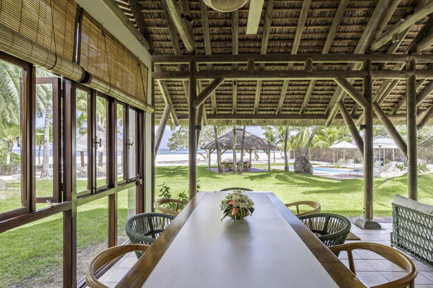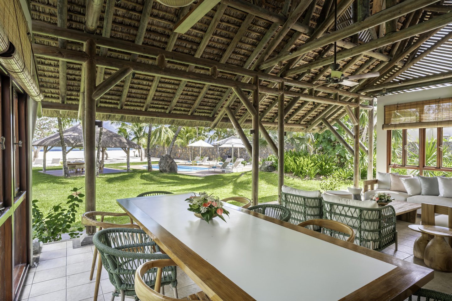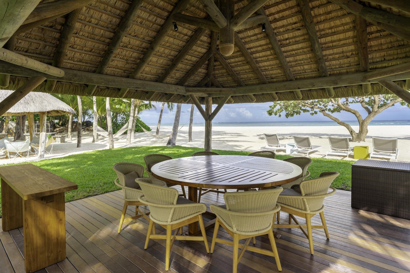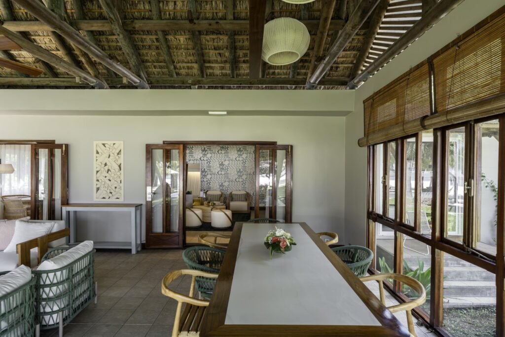 تنتشر أشجار النخيل المتمايلة في أرجاء التراس الخارجي الفسيح المكسو بأرضيات خشبية طبيعية، والممتد بمحاذاة مياه المسبح المتلألئة. كما تنتشر الطاولات في الداخل قرب منطقة البوفيه، وفي غرفة طعام مغلقة تذكّر بشرفات موريشيوس الاستعمارية مع نوافذ واسعة تُفتح على واحد من أجمل شواطئ الجزيرة.