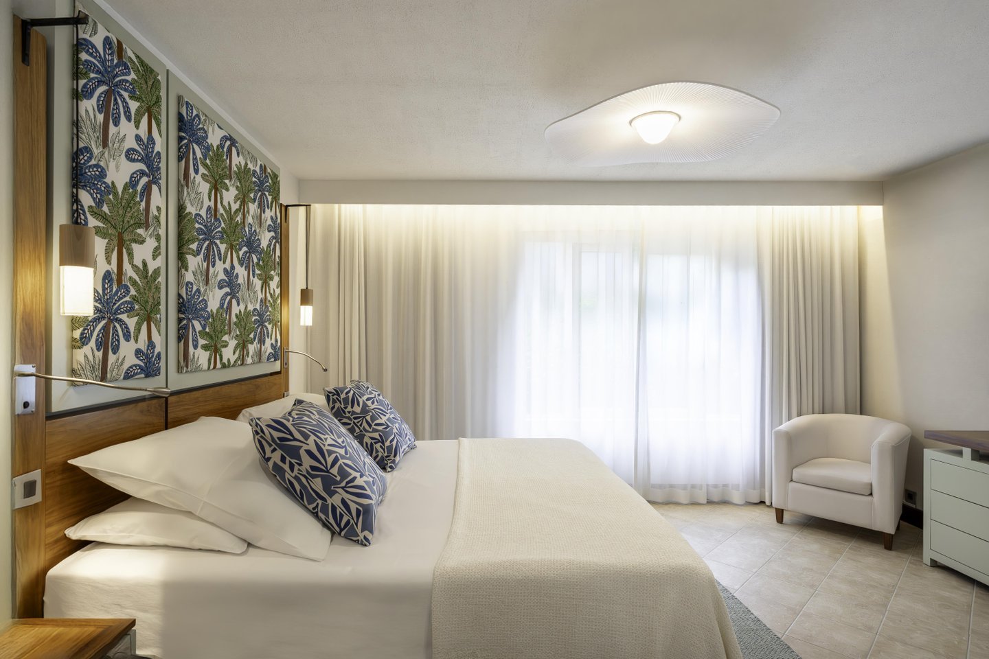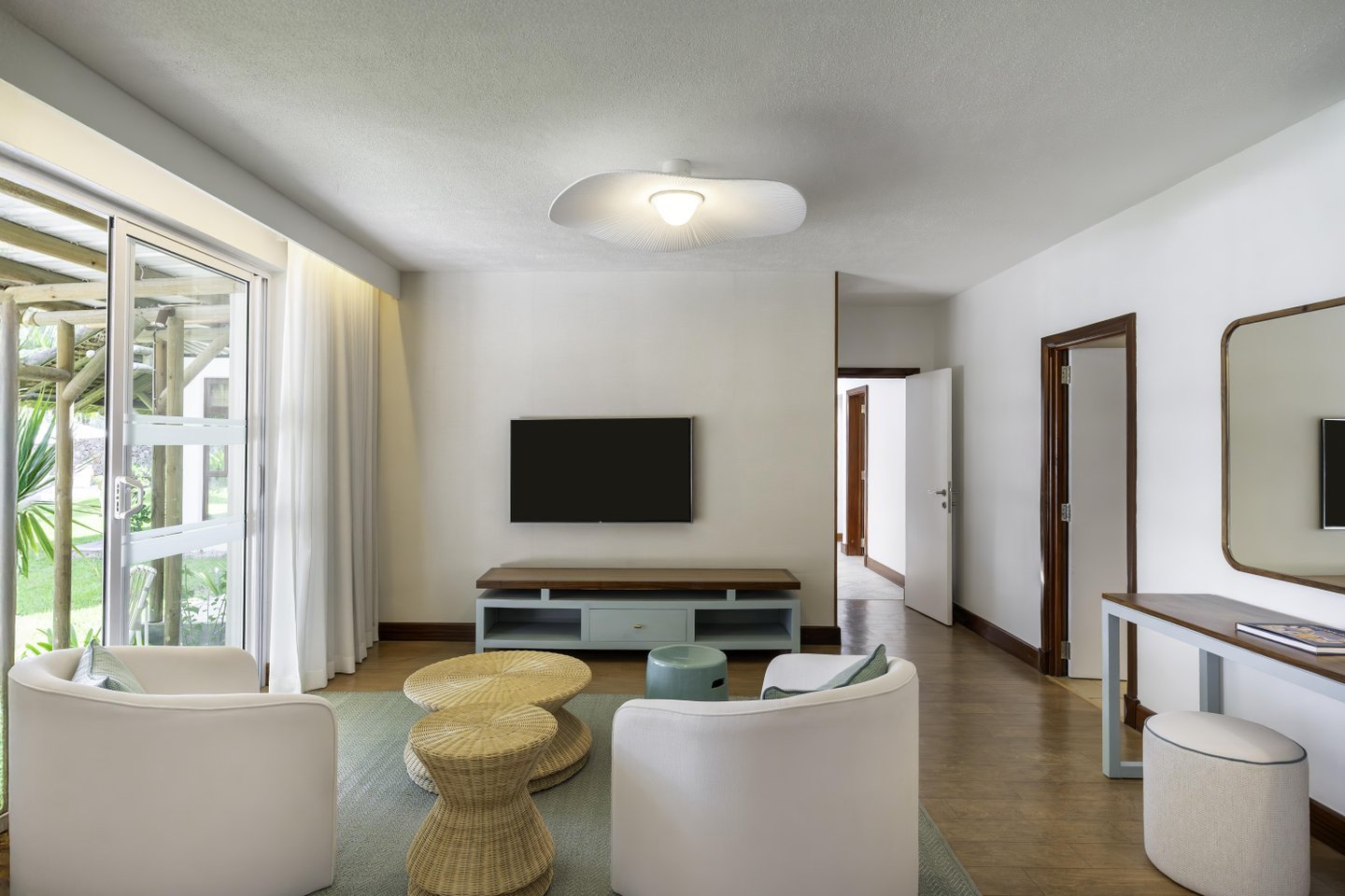 يتميز هذا الجناح الفسيح والمطل على البحر بموقعه في منطقة خاصة من المنتجع مخصصة للبالغين فقط، ليمنح الأزواج ملاذًا شاطئيًا فاخرًا ورومانسيًا مع إطلالة رائعة على الحدائق الاستوائية الغنّاء. تضم غرفة النوم الواسعة حمامًا عصريًا أنيقًا مجهزًا بدش واسع، حوض استحمام وخزانة ملابس. تتناغم الألوان الدافئة مع الأثاث الخشبي العصري لتضفي أجواء راقية، فيما تتيح الشرفة الخاصة للضيوف الاستمتاع بمشهد غروب الشمس الساحر. يغمر المكان ضوء طبيعي خلال النهار، ويتحول ليلًا إلى ملاذ دافئ يمنح الهدوء والخصوصية.