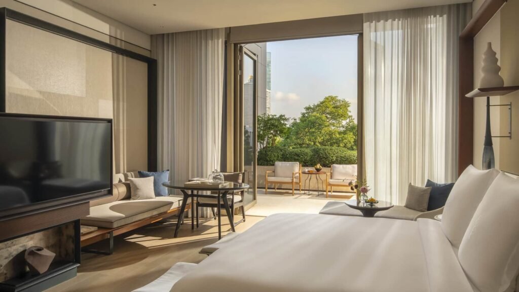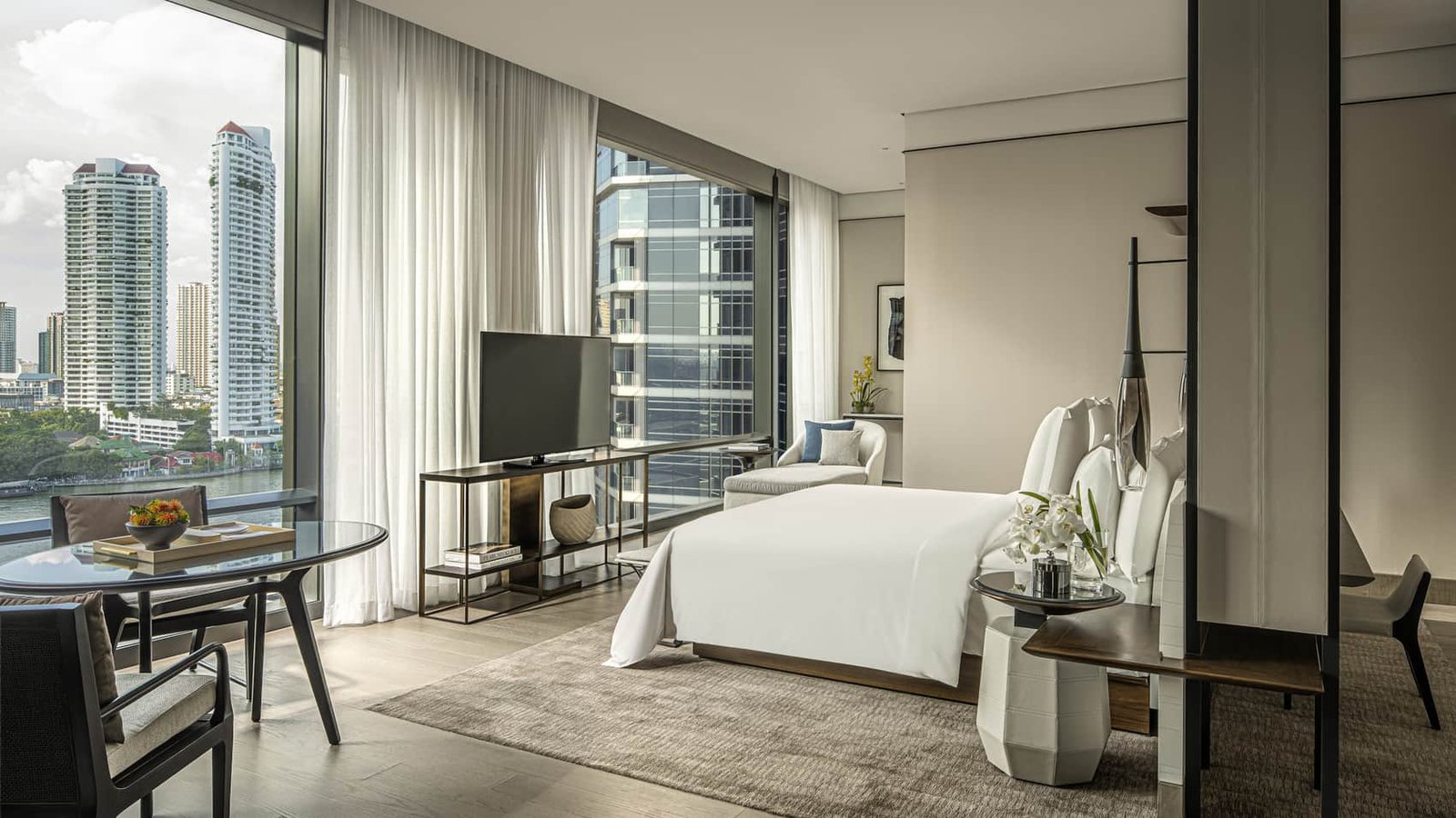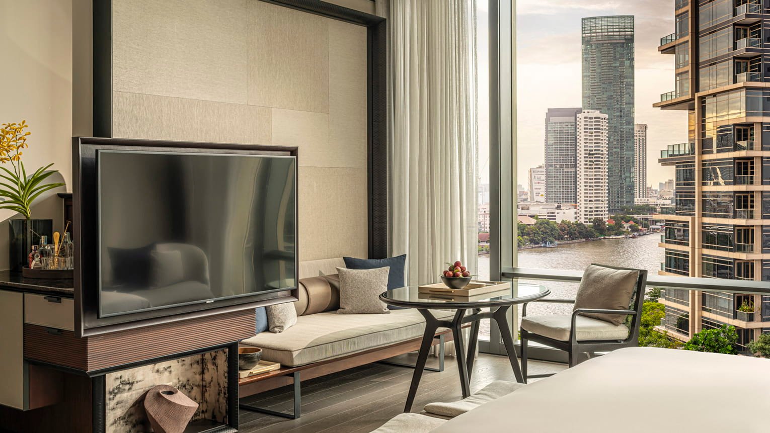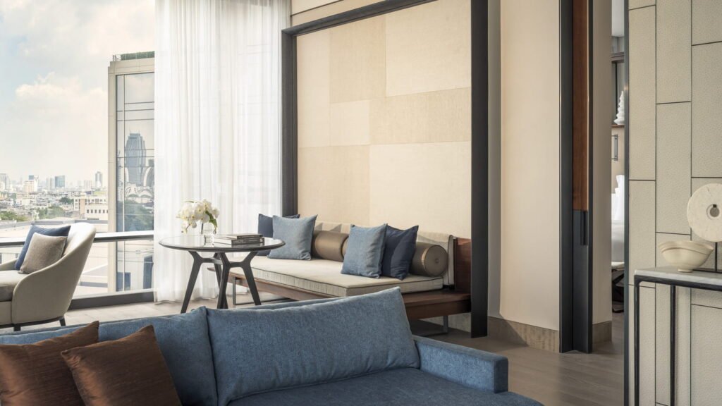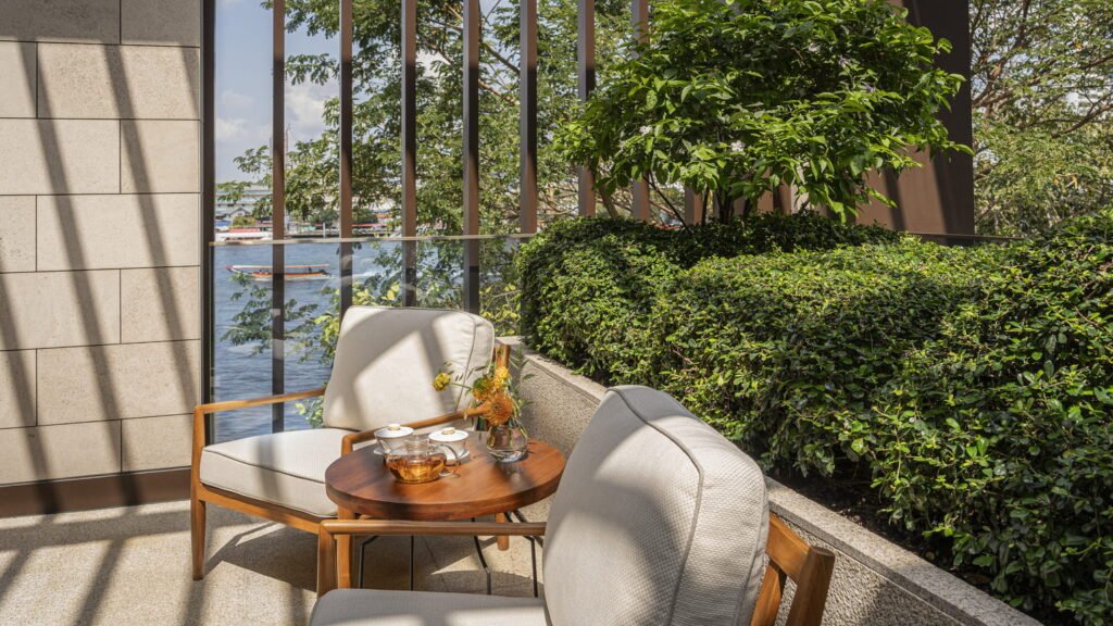 يقدّم هذا الملاذ الحضري المضيء إطلالات آسرة على نهر تشاو فرايا وعلى الفناء الواسع المفتوح. تضفي الأسقف العالية والنوافذ الكبيرة الممتدة على المشهد إحساسًا بالرحابة والانفتاح، ليمنحك أجواء هادئة ومريحة في قلب المدينة.