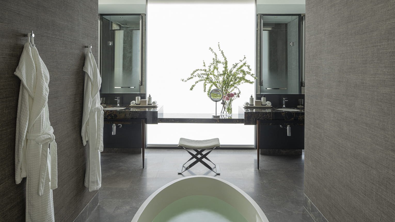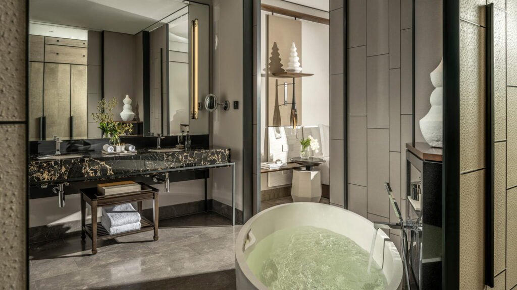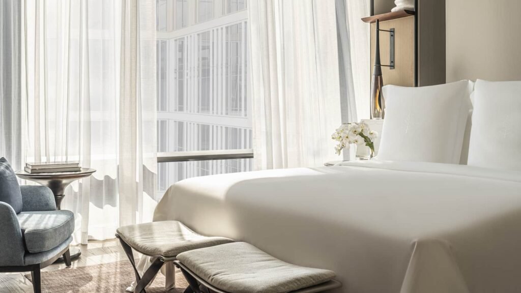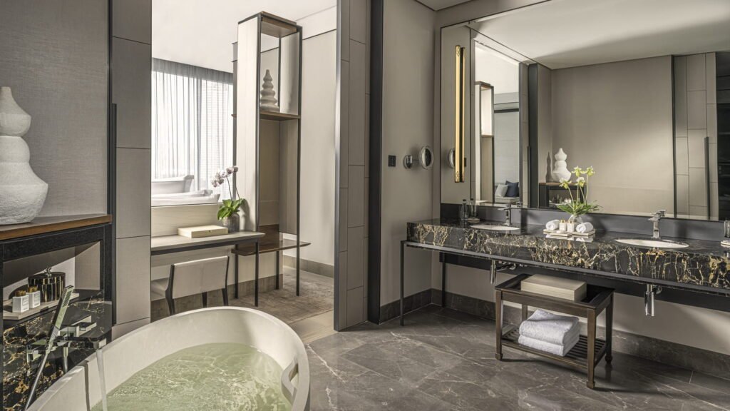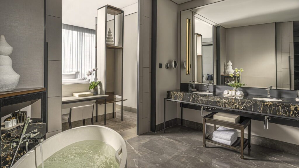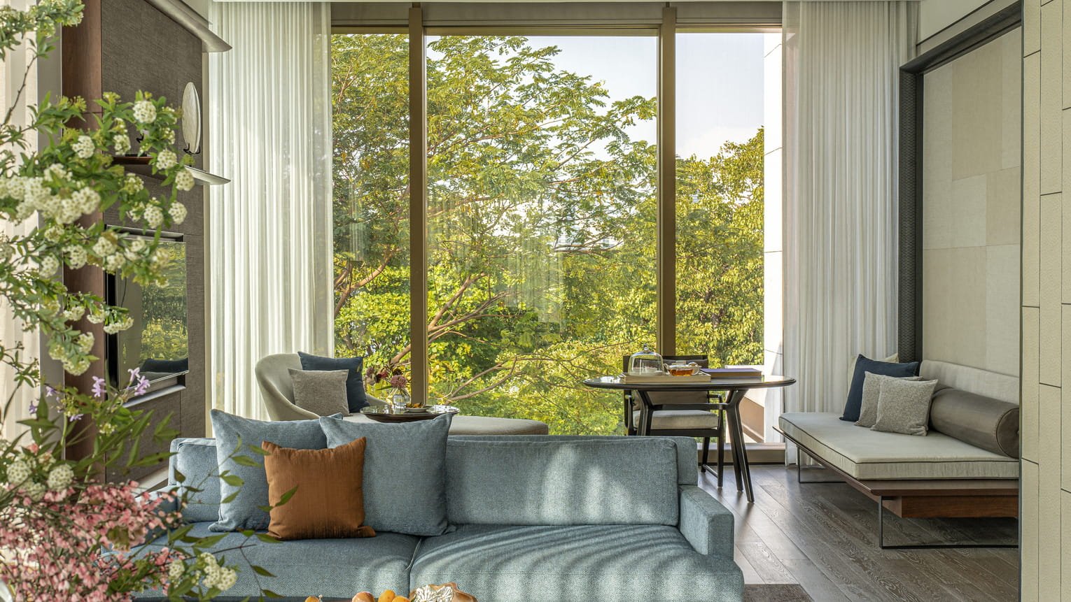 استيقظ على إطلالات خلّابة تمتد نحو الفناء المركزي الغني بالمسطحات المائية والحدائق، وذلك عبر نوافذ شاهقة بارتفاع 3.8 أمتار تمتد من الأرض إلى السقف. يغمر الضوء الطبيعي الغرفة بكثرة، ليمنحك إحساسًا بالراحة والصفاء ويدعوك للاستمتاع بلحظات أطول داخل هذا الملاذ الهادئ.