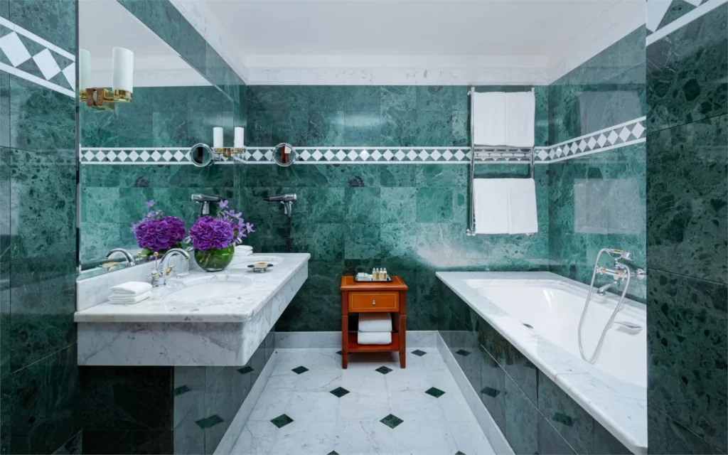 يجسد جناح هيرميتاج، المزدان بدرجات دافئة ولمسات ذهبية فاخرة، روح الفن وانتصار التاريخ الإمبراطوري الروسي في أبهى صوره. تضم مساحة المعيشة الفسيحة قطع أثاث تعود إلى القرن التاسع عشر، مصنوعة من أخشاب ثمينة، فيما تتدلى ثريا من الحديد المشغول لتضفي هيبة كلاسيكية على الأجواء. وتكتمل اللوحة الأرستقراطية بصور حكام أوروبيين بارزين، إلى جانب الإطلالات المميزة التي تنكشف من نوافذ الجناح.