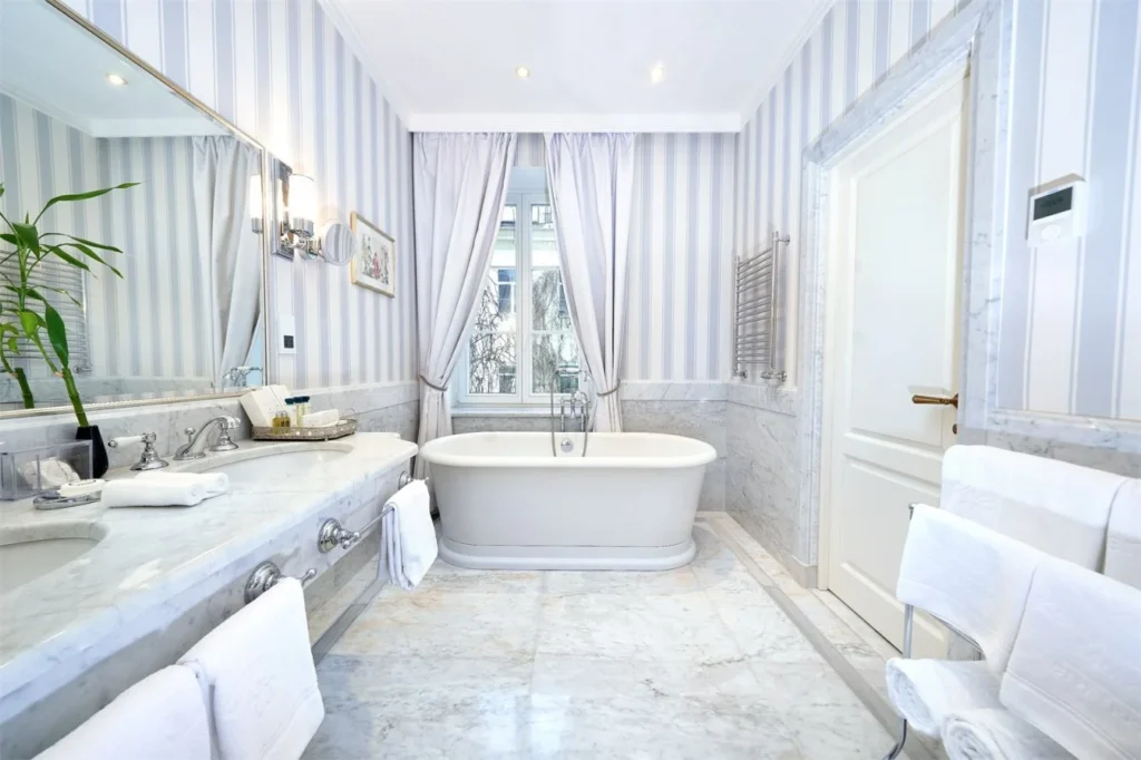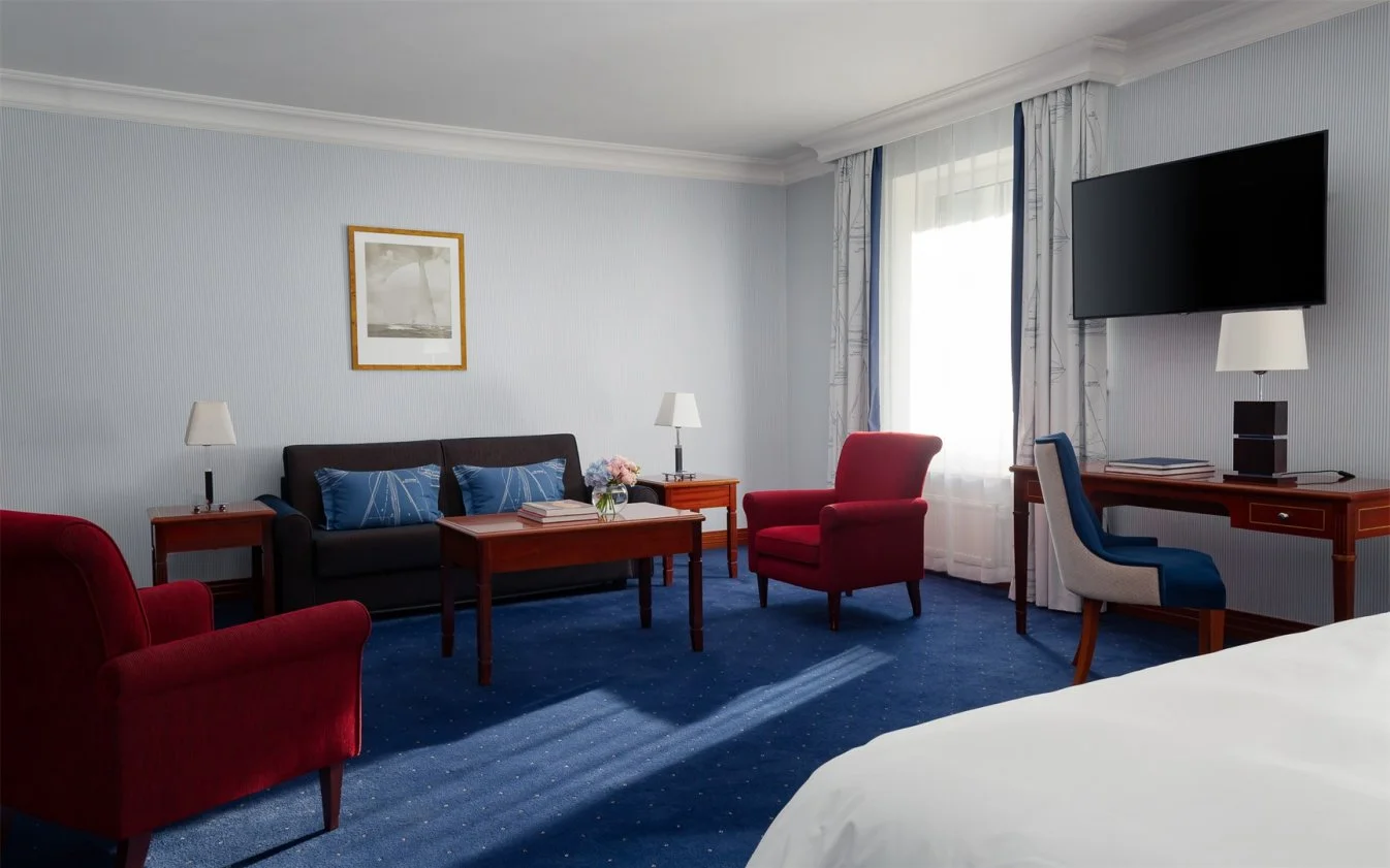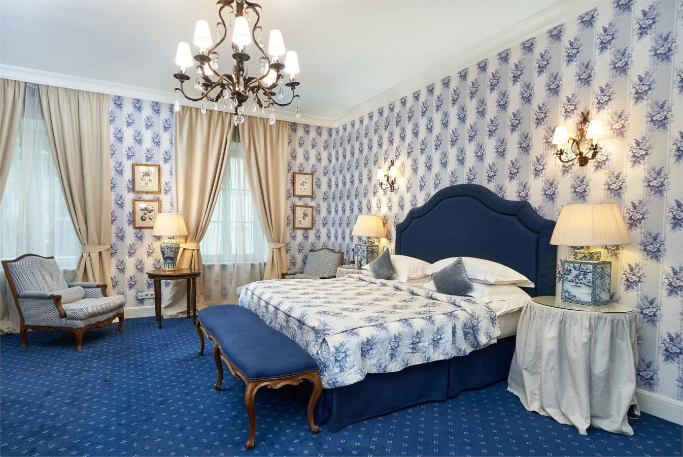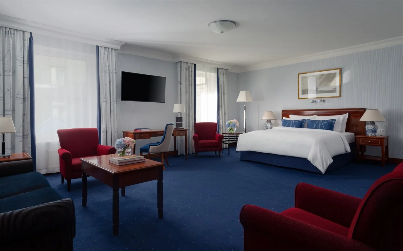 يجسد جناح «سيغنتشر» المؤلف من غرفتين أرقى تقاليد الضيافة الأوروبية الكلاسيكية، في مساحة أنيقة تنبض بالفخامة والرقي. يتميز التصميم الداخلي بتناسق لوني راقٍ يجمع بين درجات الكوبالت والأزرق والرمادي والرمل، تتجلى في نقوش ورق الجدران الفاخر والستائر والمفارش وقطع الأثاث المختارة بعناية، لتمنح الجناح هوية بصرية مميزة.