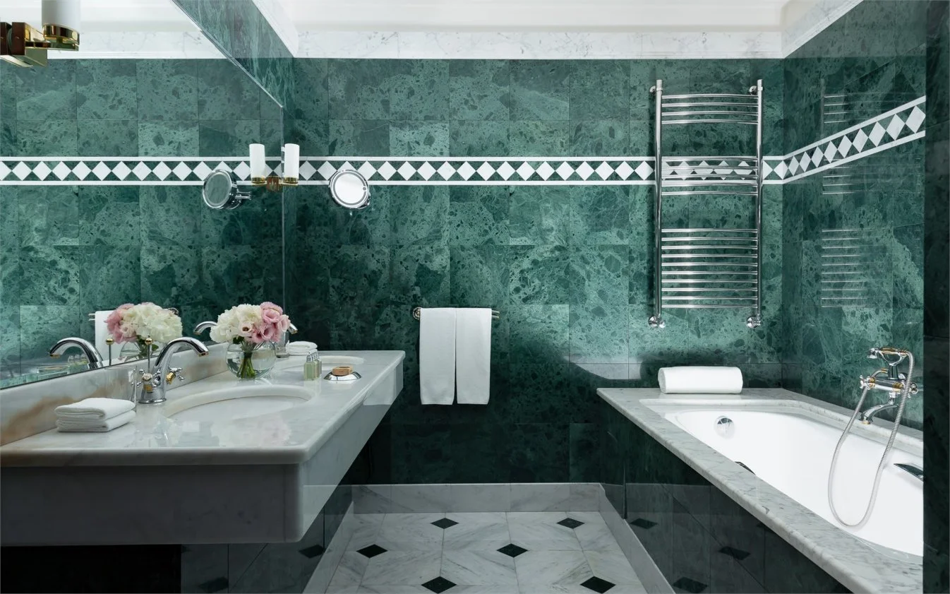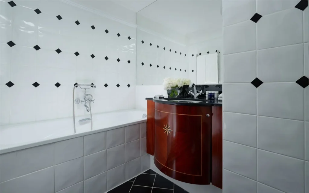 الديكور عصري مع لمسات من السحر الفرنسي، وتغلب عليه تفاصيل من الرخام الداكن والخشب. ويتناغم الذهبي والياقوتي والبنفسجي الداكن في الأثاث مع المشهد الخلاب خلف النوافذ ليمنح الضيوف متعة بصرية راقية.