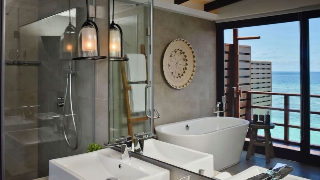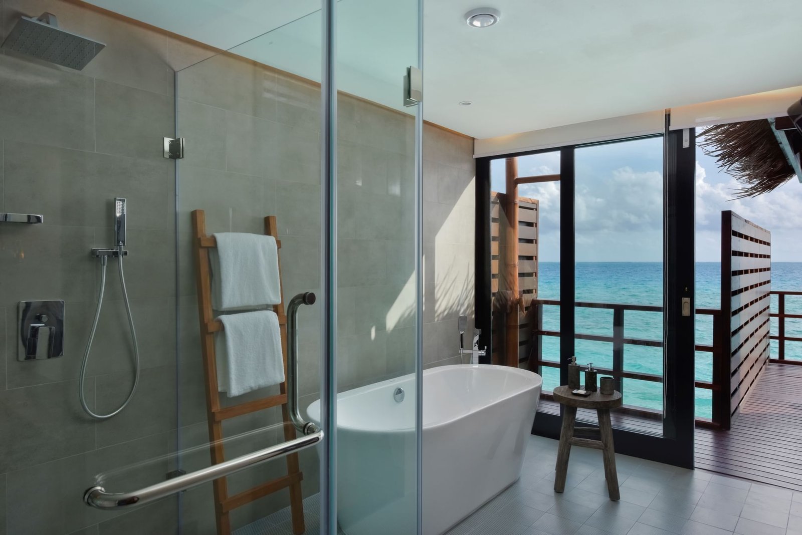 استمتع بإطلالات لا نهاية لها على المحيط في فيلا المحيط المائية، ملاذ هادئ في واحدة من أفضل الفيلات المائية في المالديف. احصل على وصول مباشر إلى المياه الصافية من خلال درج خاص، واستمتع بحمام واسع مجهز بدش داخلي وخارجي.
