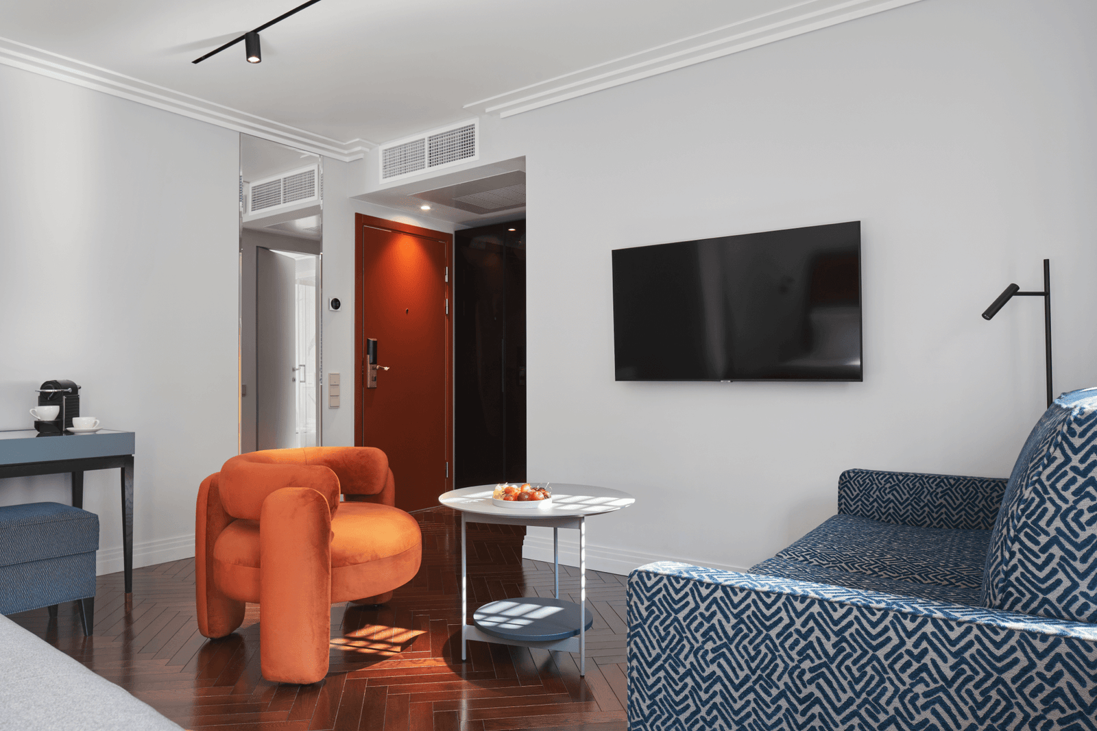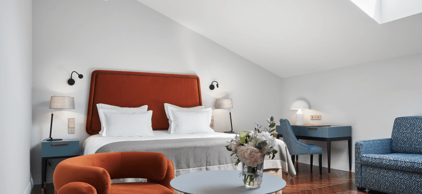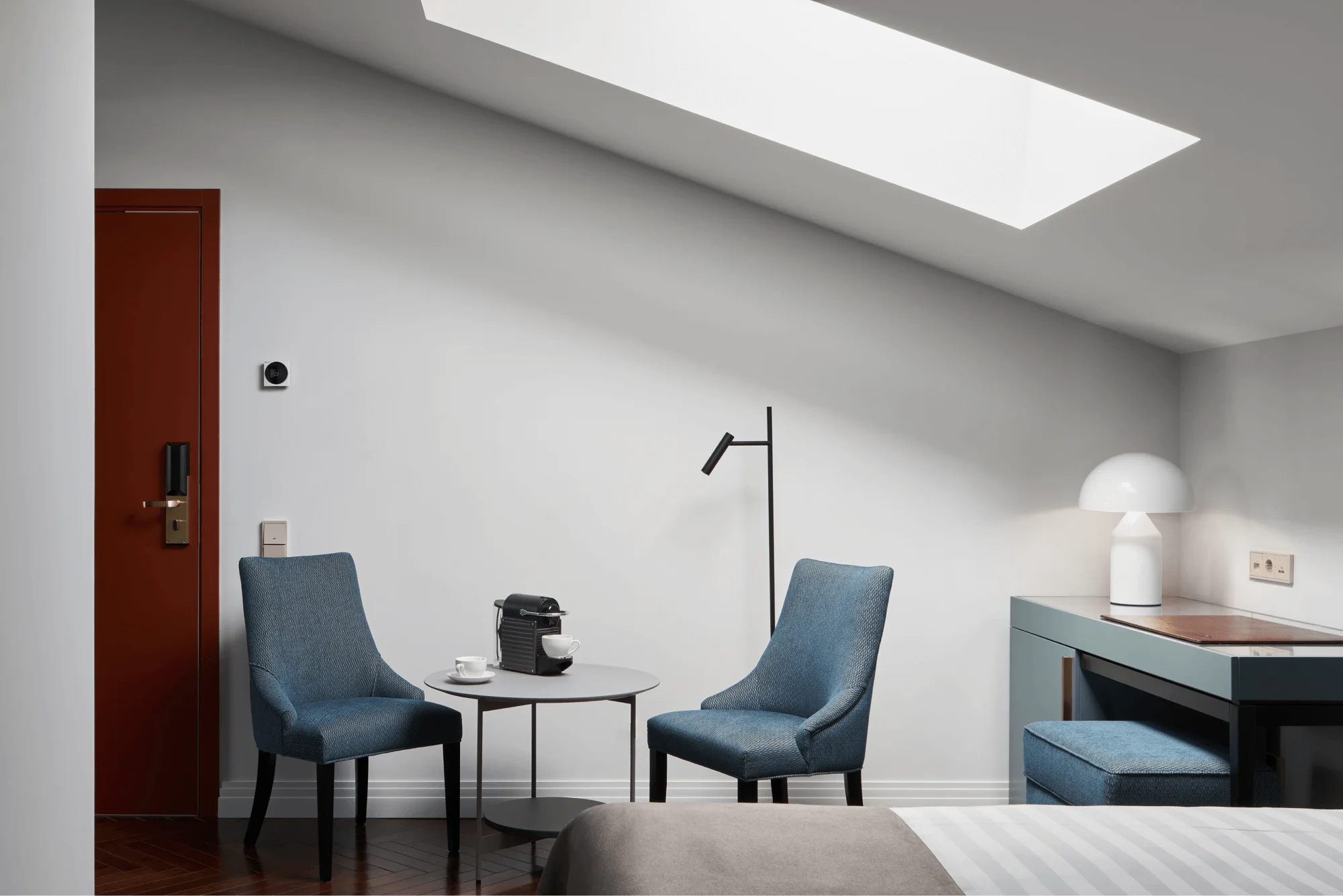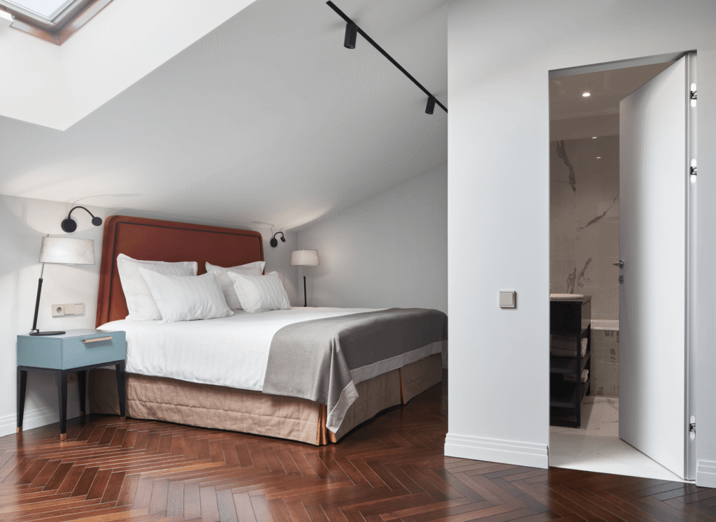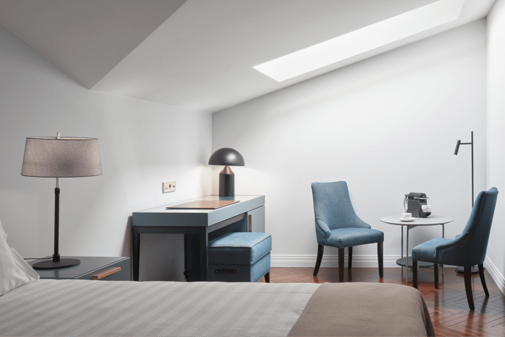تتمتع غرف سكاي بسحرٍ خاص وجاذبيةٍ فريدة بفضل تصميمها العلوي في الطابق الأخير، حيث توفر أجواء دافئة ورومانسية مثالية للاسترخاء. تضم الغرفة سريرًا كبيرًا مريحًا، وأريكة أنيقة، ومنطقة عمل مزودة بمكتب مريح، لتجمع بين الراحة والوظائف العملية في آنٍ واحد. كما تحتوي على آلة نسبريسو لإعداد القهوة ومحطة شاي، بالإضافة إلى خدمة واي فاي مجانية وتلفاز فضائي، مما يجعلها من أكثر الغرف المحبوبة في الفندق.