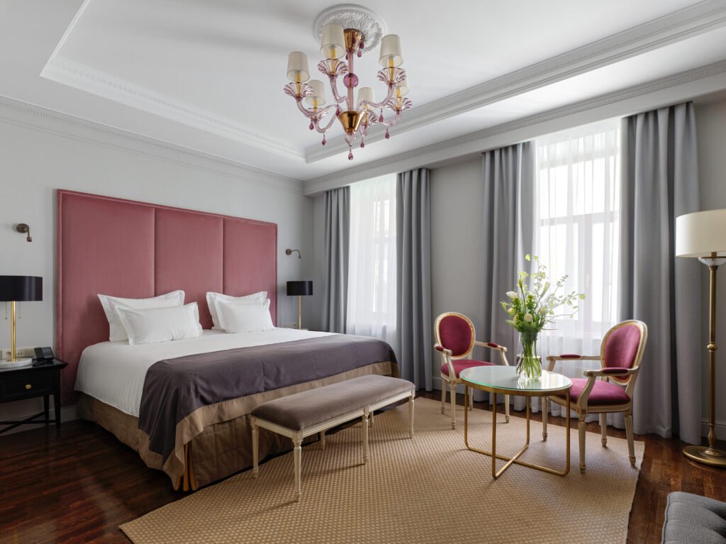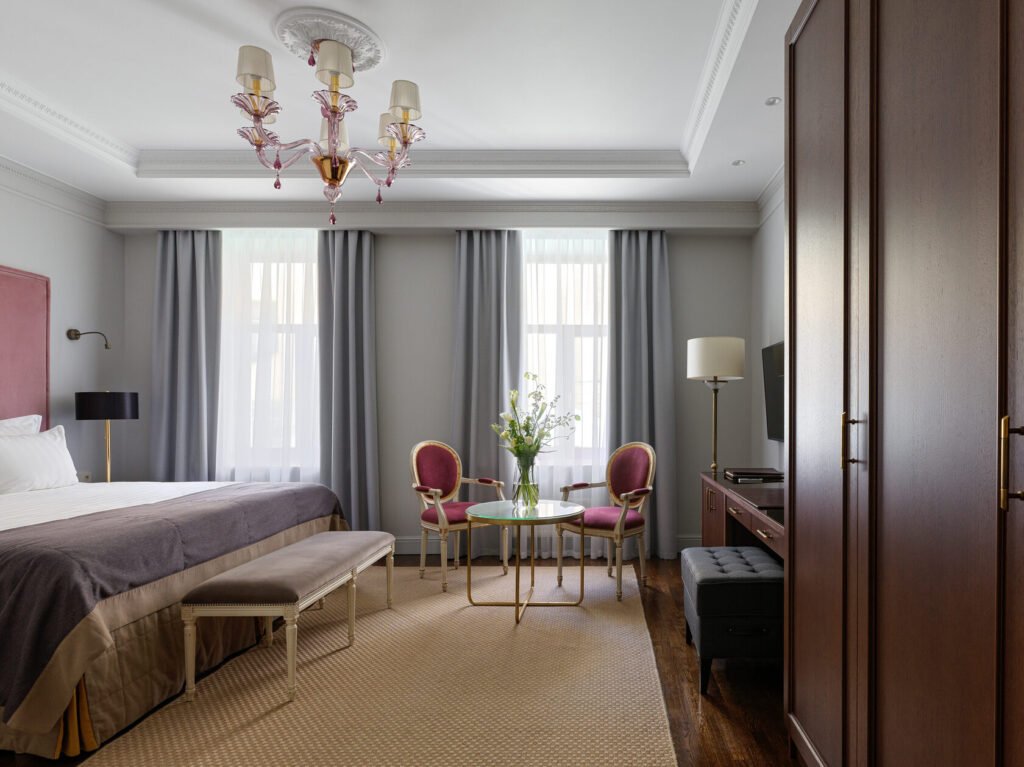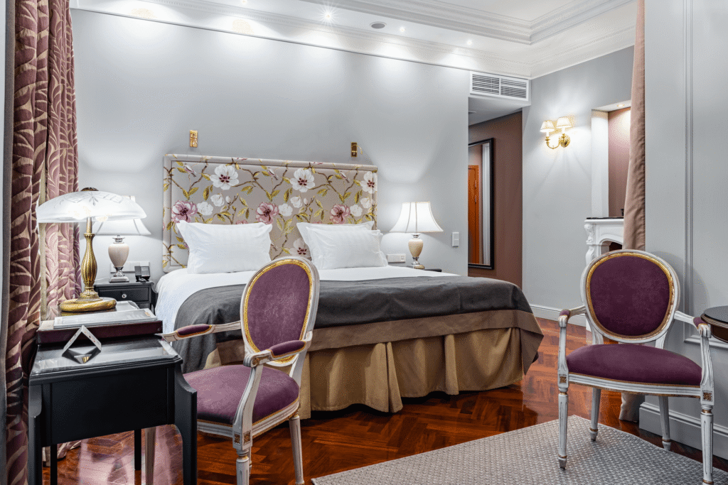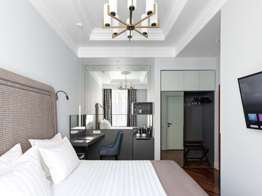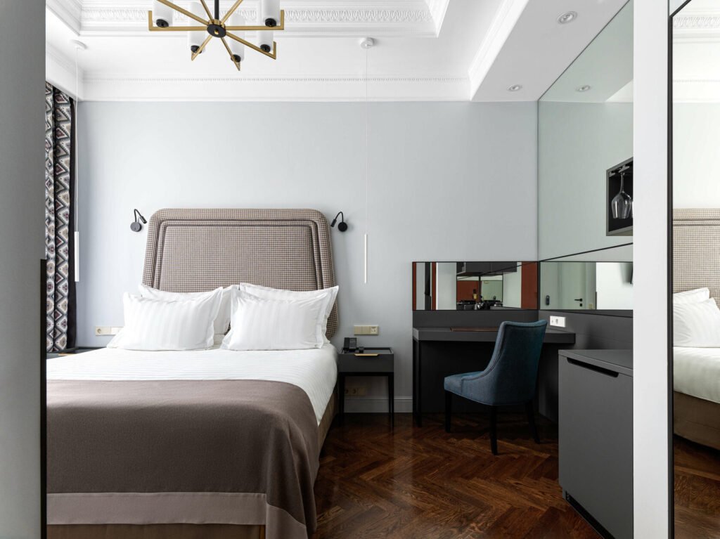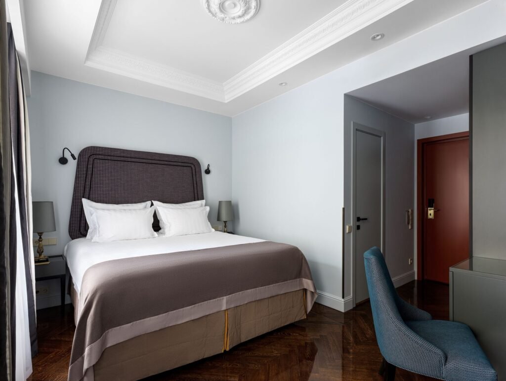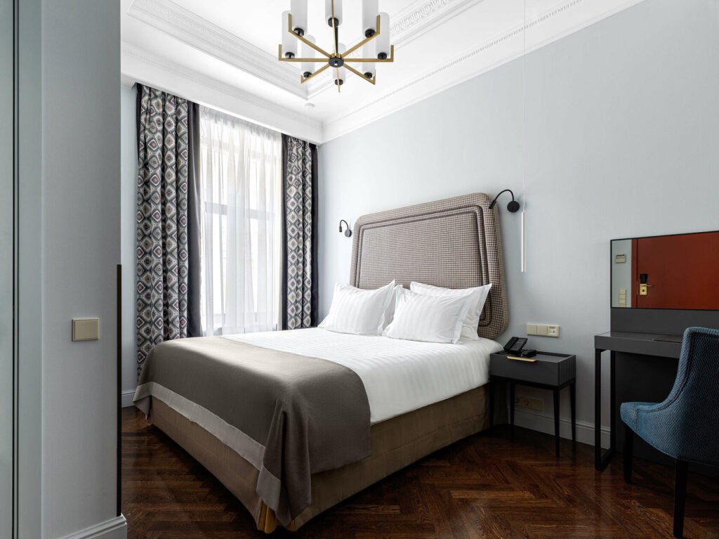 تجمع غرفة الديلوكس بين الأناقة والراحة في تصميم كلاسيكي مستوحى من تاريخ وعبق مدينة سانت بطرسبورغ ما قبل الثورة. تضم الغرفة سريرًا كبيرًا مريحًا ومنطقة عمل مناسبة توفر بيئة مثالية للاسترخاء أو إنجاز المهام.