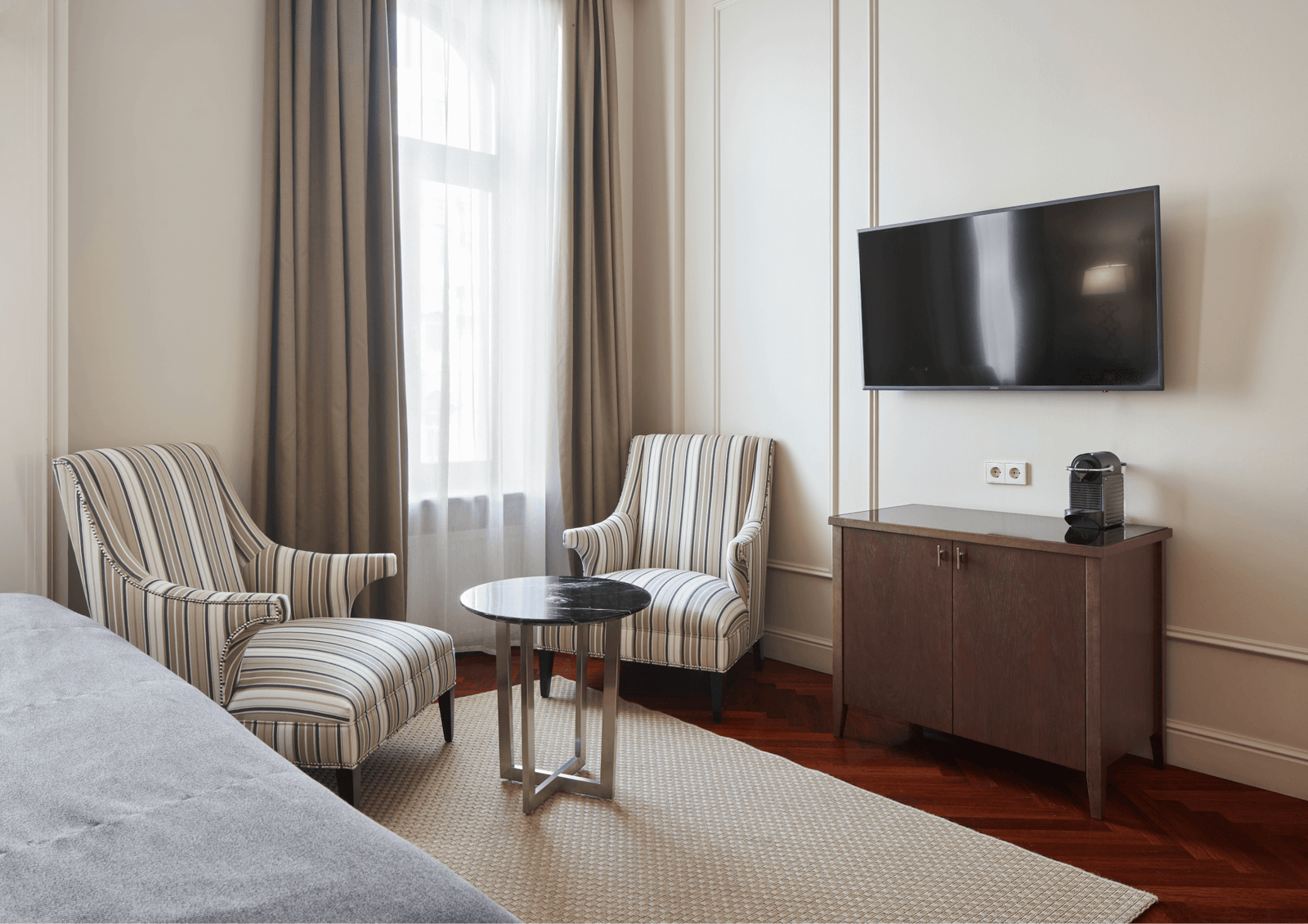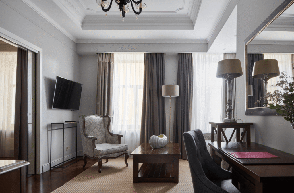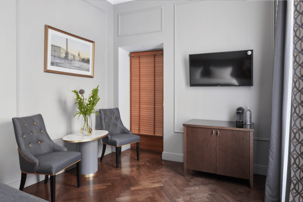تتميز غرفة كلاسيك بتصميمها الأنيق المستوحى من الطراز الكلاسيكي لمدينة سانت بطرسبرغ، وتوفر كل ما يحتاجه المسافر من راحة وأناقة. تضم الغرفة سريرًا كبيرًا مريحًا، ومنطقة عمل مزودة بمكتب عملي، بالإضافة إلى آلة نسبريسو لإعداد القهوة ومحطة شاي. كما توفر خدمة واي فاي مجانية وتلفازًا فضائيًا لضمان إقامة مريحة ومتكاملة.