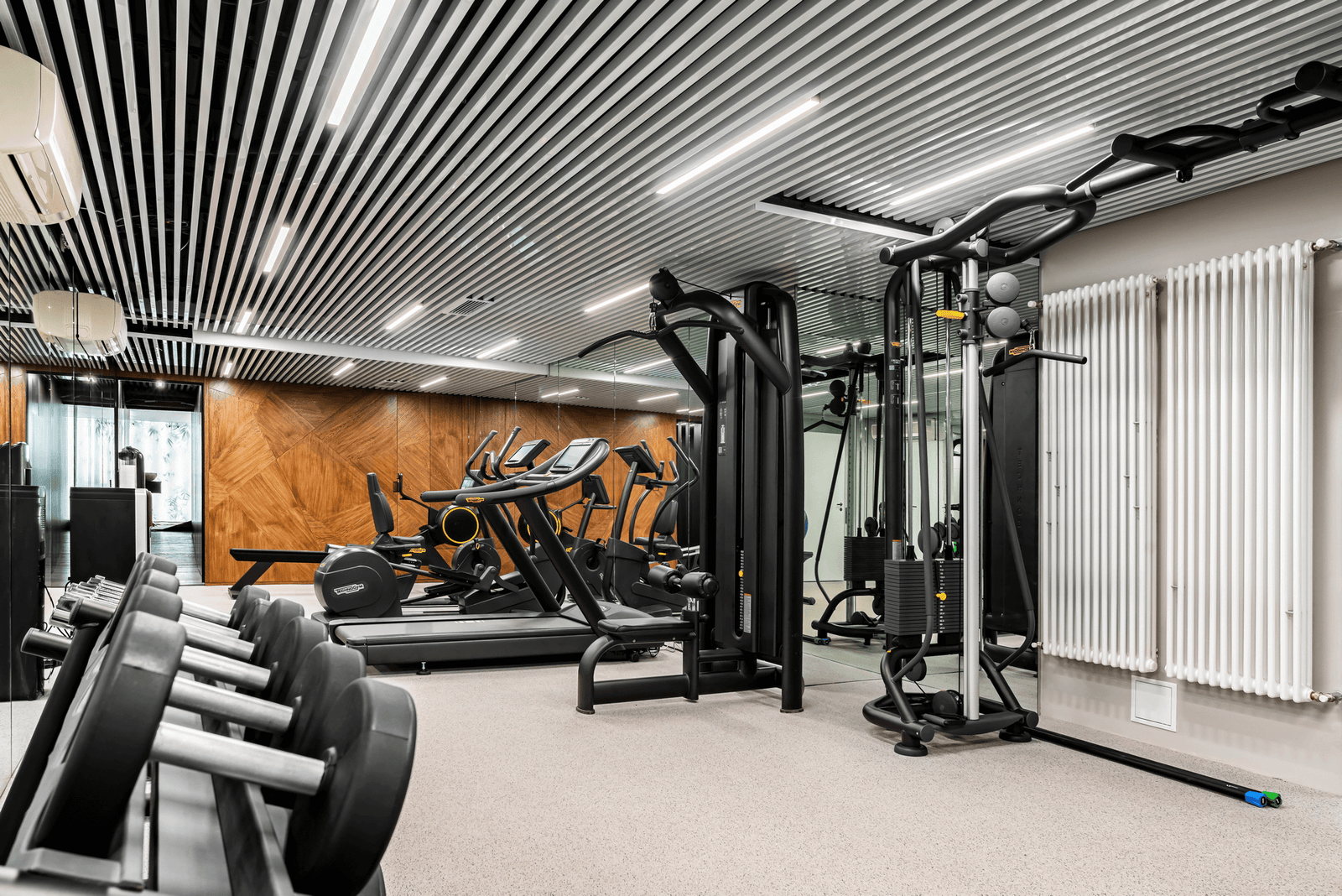 تضم الصالة مساحة قدرها 80 مترًا مربعًا مجهزة بأحدث أجهزة Technogym الإيطالية التي تتيح تدريب جميع عضلات الجسم بفعالية.