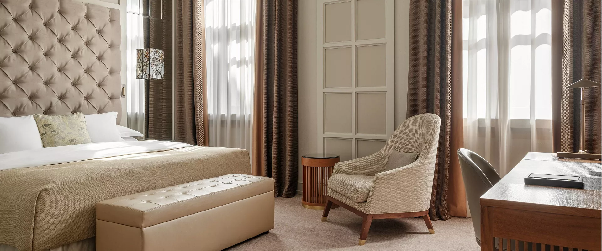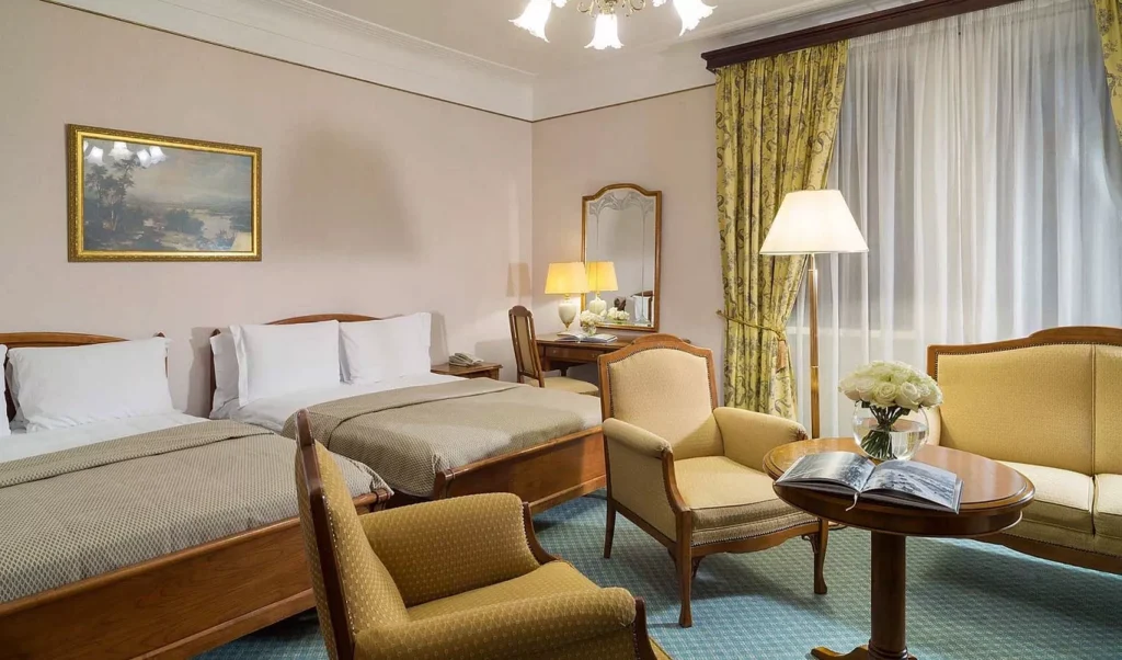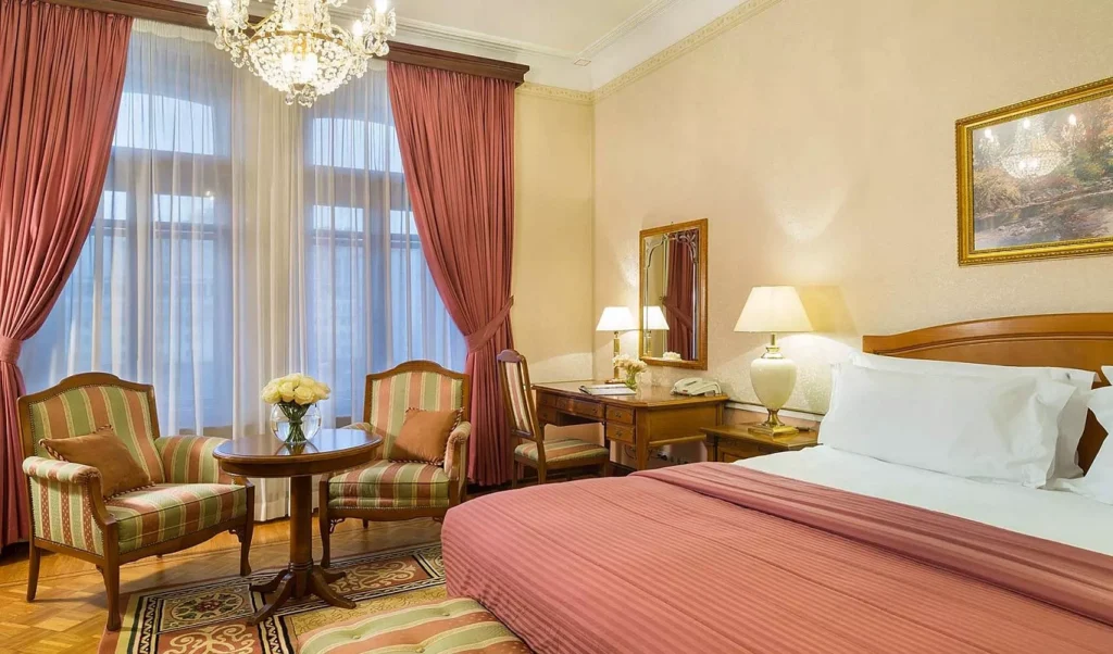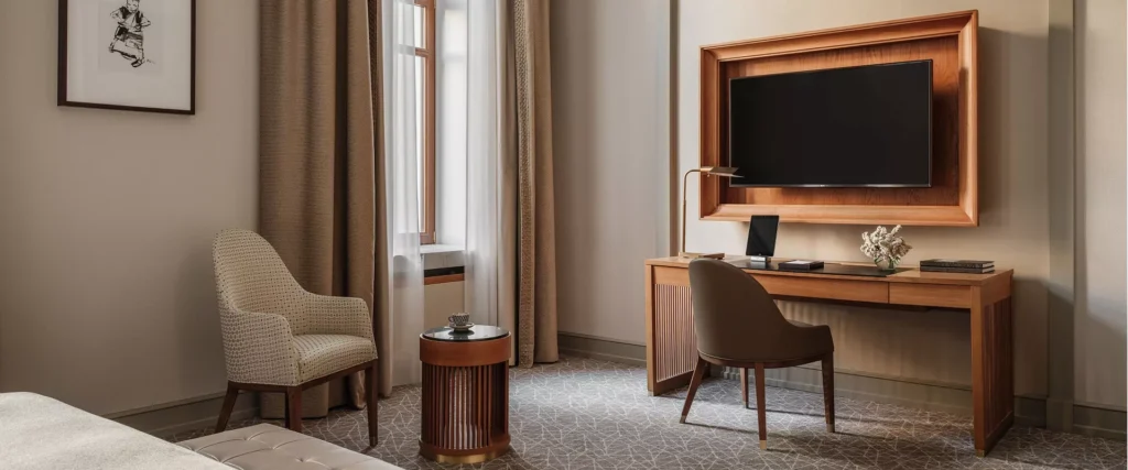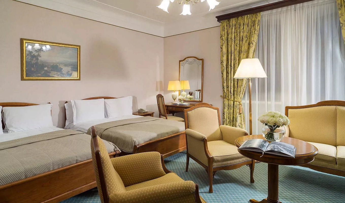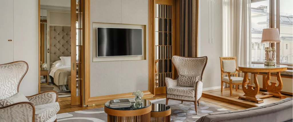 تجمع غرفة سينيشر ديلوكس بين التصميم الأنيق والمساحات الواسعة والراحة العصرية. تمنحك لوحة الألوان الفاتحة مع التفاصيل الكلاسيكية والإضاءة الناعمة أجواء من الهدوء والفخامة. تضم الغرفة منطقة عمل مجهزة بمكتب مريح ومنطقة جلوس بأثاث راقٍ تتيح لك عقد الاجتماعات أو الاسترخاء بأناقة. كما توفر النوافذ الكبيرة إطلالة خلابة على قلب موسكو النابض بالحياة. بفضل التقنيات الذكية والخدمة الراقية، ستستمتع بإقامة مفعمة بالراحة والرقي.