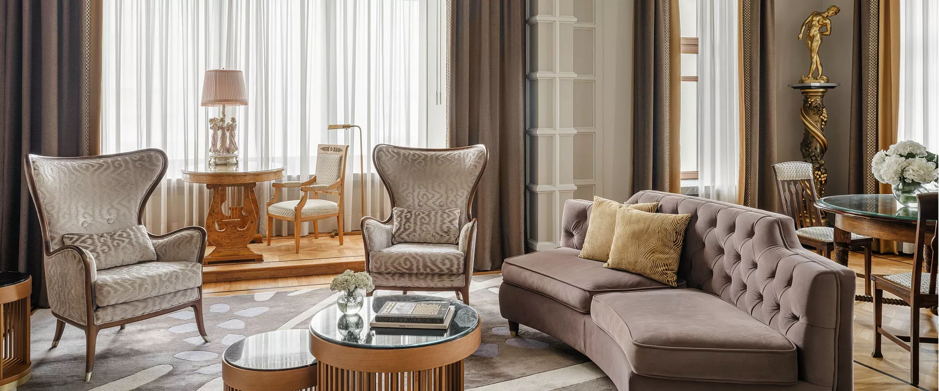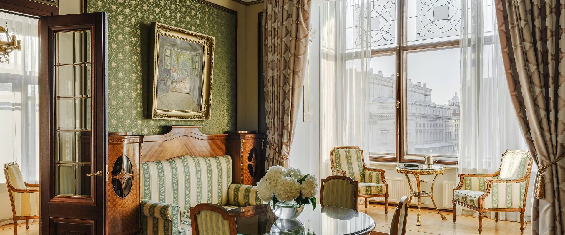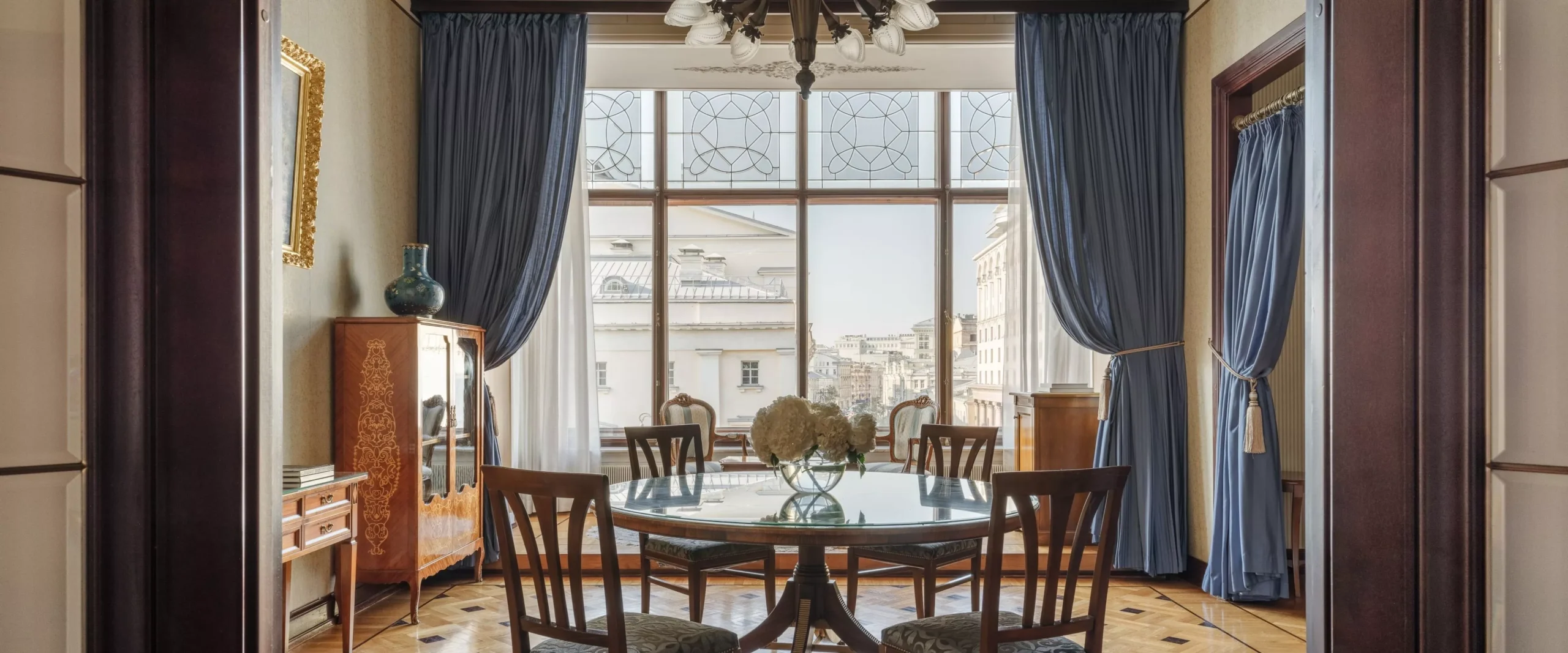 يُجسّد جناح السفير الأناقة وذروة مستويات الضيافة الرفيعة. من نوافذه يمكن للضيوف التمتع بإطلالة ساحرة على مركز موسكو التاريخي، بينما ينقل الديكور الداخلي المزدان بالأثاث العتيق، والثريات الكريستالية، والأعمال الفنية الضيوف إلى عصر خاص ومميز. يضم الجناح ثلاث غرف فاخرة: غرفة نوم مزودة بسرير كينج، وغرفة معيشة واسعة مع منطقة لتناول الطعام، ومكتب للعمل أو الاسترخاء. تضمن أحدث التقنيات، بما في ذلك نظام "المنزل الذكي"، راحة لا مثيل لها. ويكتمل الجو الراقي بإتاحة ميني بار مع ثلاجة للنبيذ وطقم شاي من البورسلان الإمبراطوري.