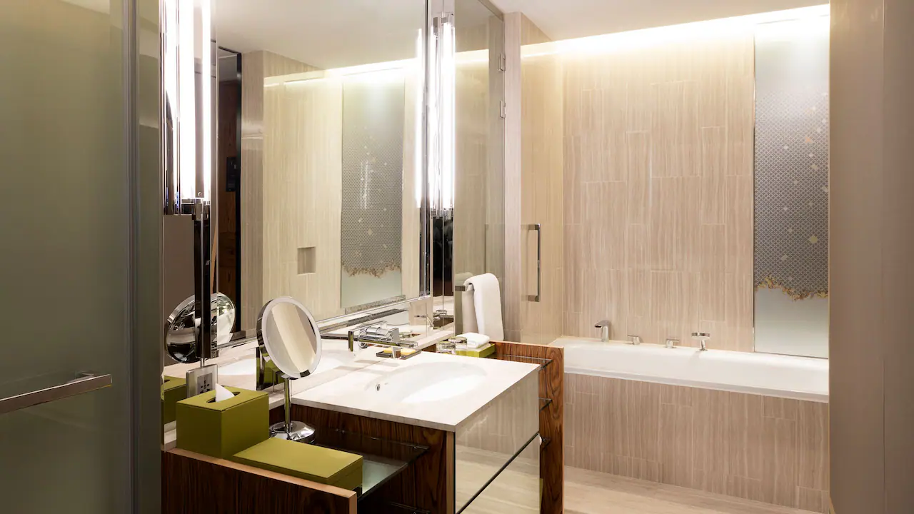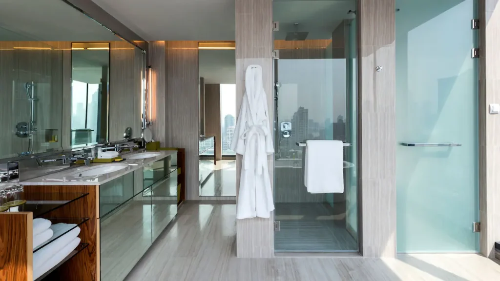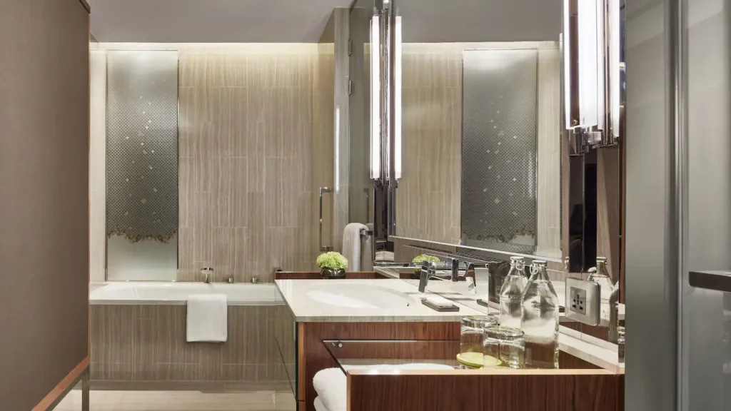 كما تضم الغرف حمامًا فاخرًا مجهزًا بدش منفصل وحوض استحمام مستقل، ليوفر للضيوف أعلى درجات الراحة والاسترخاء.