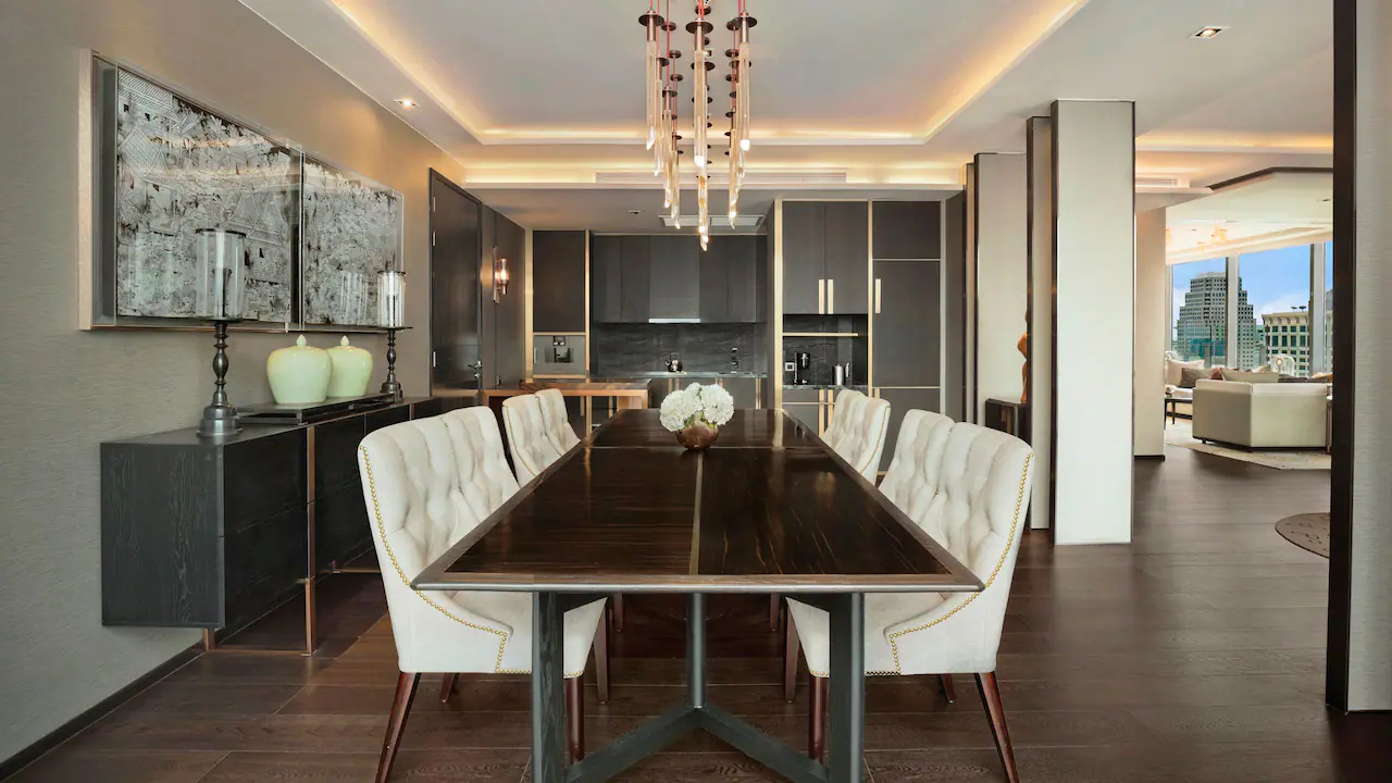 يقع هذا الجناح الرئاسي الفخم في الطابق 28، ويوفّر مساحة استثنائية تبلغ 208 أمتار مربعة، بالإضافة إلى 33.5 مترًا مربعًا من المساحة الخارجية. يقدّم الجناح إطلالات بانورامية آسرة على مدينة بانكوك، ويضم منطقة معيشة واسعة، وغرفة طعام تتّسع لـ10 أشخاص، ومطبخًا صغيرًا (بانتري)، وغرفة تمارين خاصة، إلى جانب غرفة نوم تضم سرير كينج فاخر. يشمل الجناح كذلك إمكانية الدخول إلى صالة ريجنسي كلوب للاستمتاع بالمزايا والخدمات الحصرية. يُعد هذا الجناح من الفئات الفاخرة المتميّزة. يُرجى مراجعة شروط برنامج World of Hyatt لمعرفة مدى أهلية الترقية.