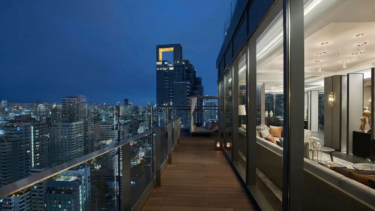 يقع هذا الجناح الفاخر في الطوابق من 25 إلى 27، ويقدّم تجربة إقامة استثنائية ضمن مساحة واسعة تتراوح بين 120 و124 مترًا مربعًا. يضم الجناح منطقة معيشة مستقلة، وحمّامًا مجهزًا بدش غامر مستقل وحوض استحمام منفصل، بالإضافة إلى مساحات عمل رحبة مخصّصة لراحة الضيوف. يتمتع الجناح أيضًا بإطلالات بانورامية خلّابة على مدينة بانكوك، وهو من الفئات المتميّزة في الفندق. يُرجى مراجعة شروط برنامج World of Hyatt للتعرّف على مدى أهلية الترقية.