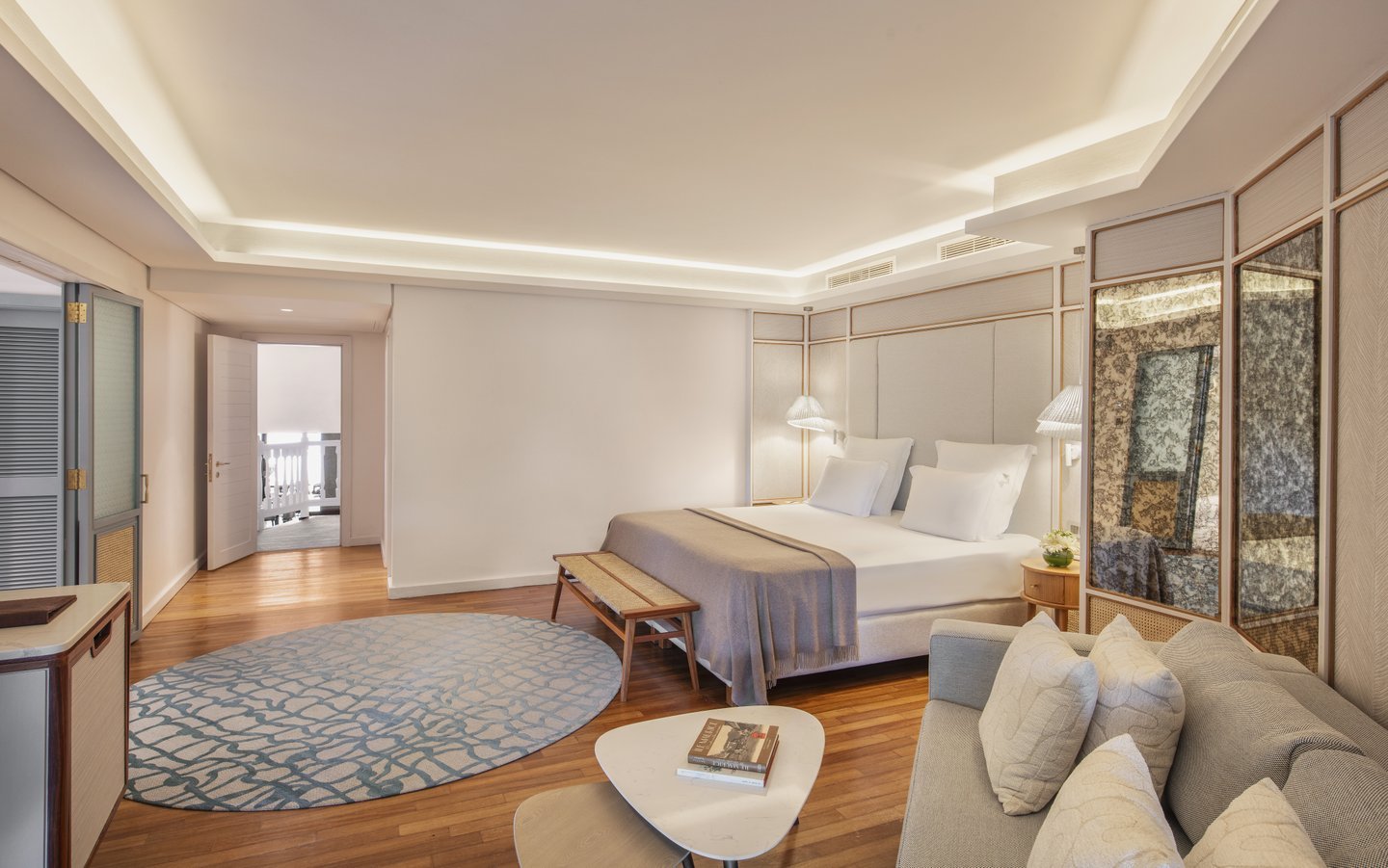 يقدّم الجناح الرئاسي في رويال بالم أعلى مستويات الراحة والفخامة، مع مساحة شاسعة تبلغ 260 مترًا مربعًا تستوعب حتى أربعة أشخاص بالغين. يضم الجناح غرفتي نوم، حمّامين، غرفة معيشة، وتراسًا واسعًا مثاليًا للاسترخاء. تُرحّب هذه الأجنحة الفخمة بضيوفها بديكور كلاسيكي أنيق وراقي، حيث تتميّز غرف النوم بإضاءة طبيعية وأجواء مشرقة وهادئة تعكس إحساسًا عميقًا بالسكينة. أمّا الحمّامات فتتزيّن بسقف زجاجي يتيح تدفّق الضوء الطبيعي لإضفاء لمسة من النقاء والجمال.