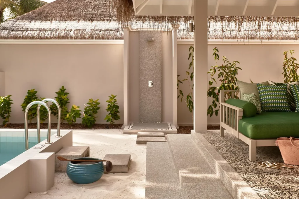 اختبر الراحة والاسترخاء الحقيقي على الطريقة المالديفية في هذه الفيلا الرائعة المطلة على الشاطئ مع مسبح خاص. تخيل أن تستيقظ صباحًا وتستمتع بالإطلالة الخلابة على حديقتك الخاصة المورقة، ثم تتجول عبر الحديقة إلى الشاطئ والبحيرة المرجانية الرائعة خلفها. استرخِ تمامًا في مسبحك الخاص.