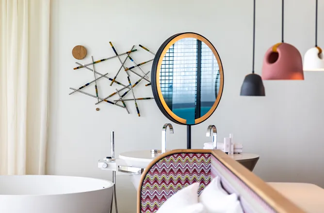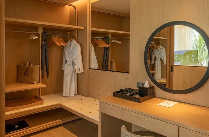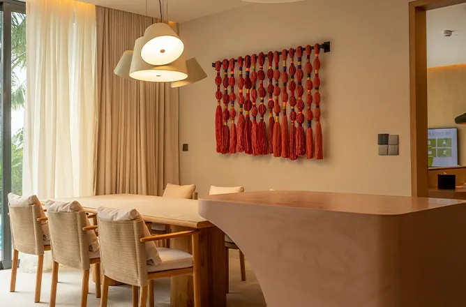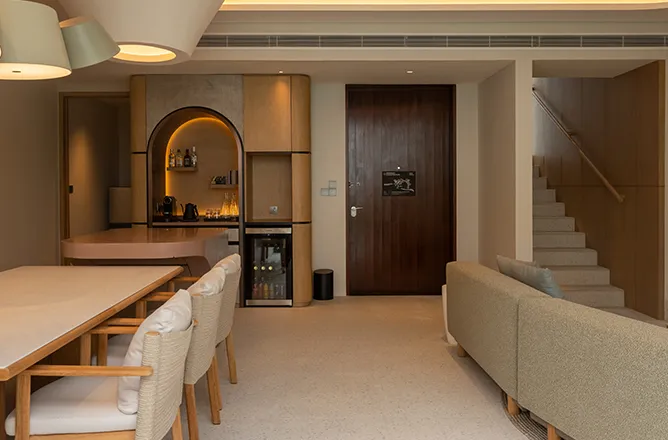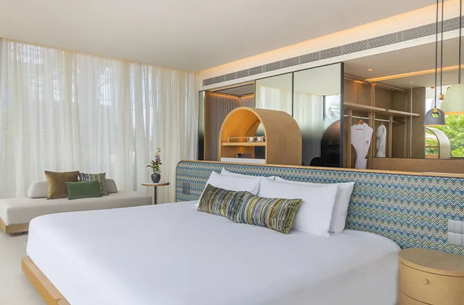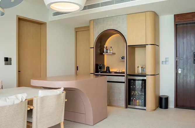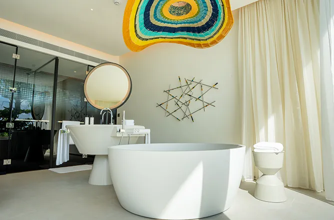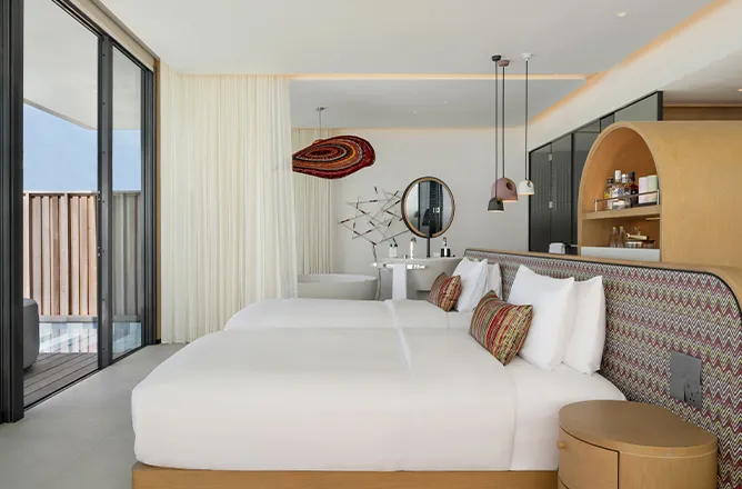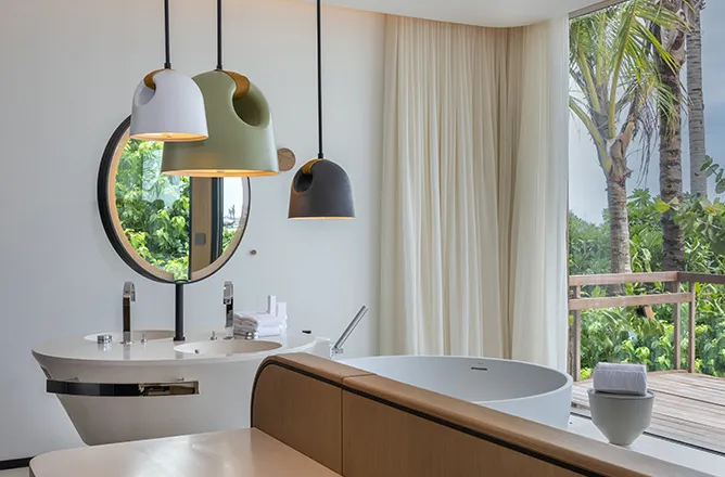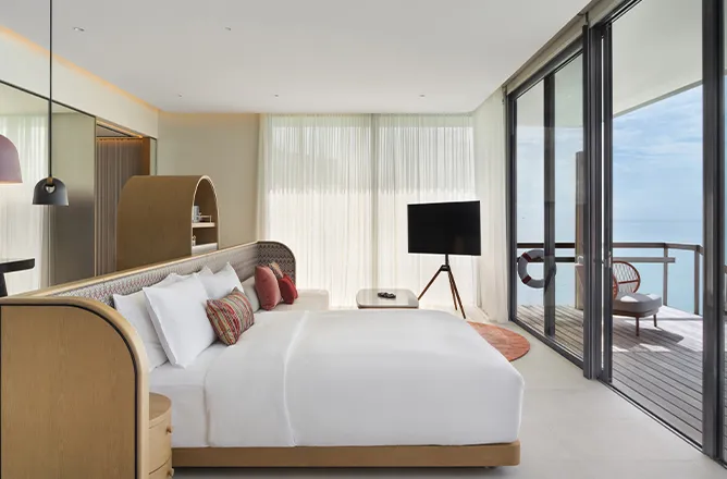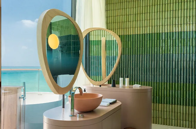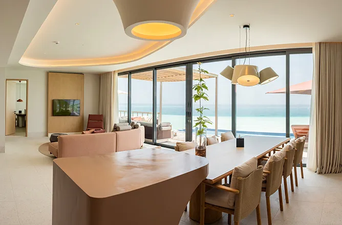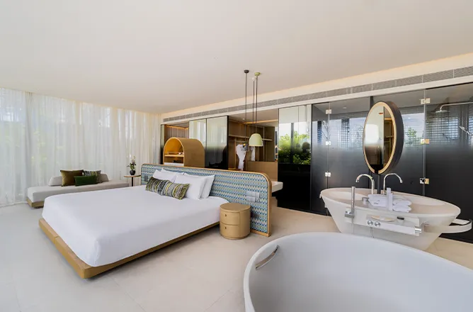 اقفز مباشرة إلى المياه الفيروزية من مسبحك الخاص بتصميم مخطط، أو استمتع بالهدوء من مساحتك المضيئة والمريحة، المزودة بحوض استحمام حر الشكل، ونوافذ بانورامية، ولوحة ألوان مستوحاة من الطبيعة مع لمسات تصميمية ملونة.