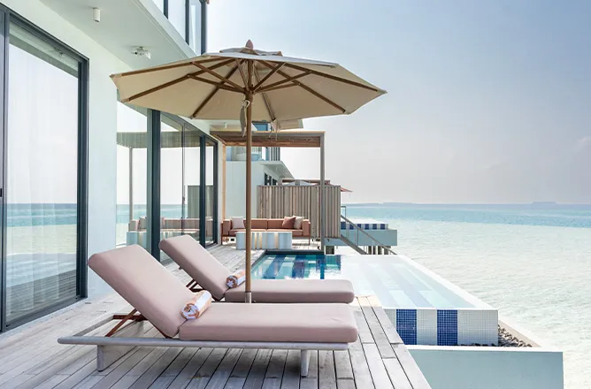 انعم بتجربة عصرية على الرمال البيضاء، واختر من بين فيلات الشاطئ الزجاجية الحديثة. لعشّاق السباحة والغطس، تُعدّ فيلات اللاجون الخيار الأمثل. أما الباحثون عن العزلة الكاملة، ففيلات الأوشن تُوفّر مشاهد لا نهائية للبحر المالديفي.