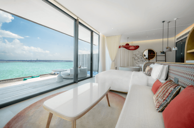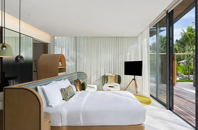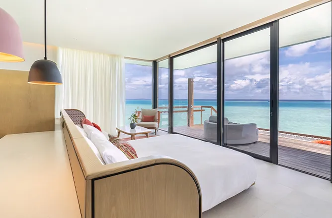 استمتع بالإقامة في فيلات عصرية تمتد فوق البحيرة الفيروزية أو تطل على المحيط المفتوح. انزل مباشرة إلى المياه الدافئة من مسبحك المخطط الخاص، أو استرخِ في المساحات الداخلية ذات التصميم المنفتح على الطبيعة.