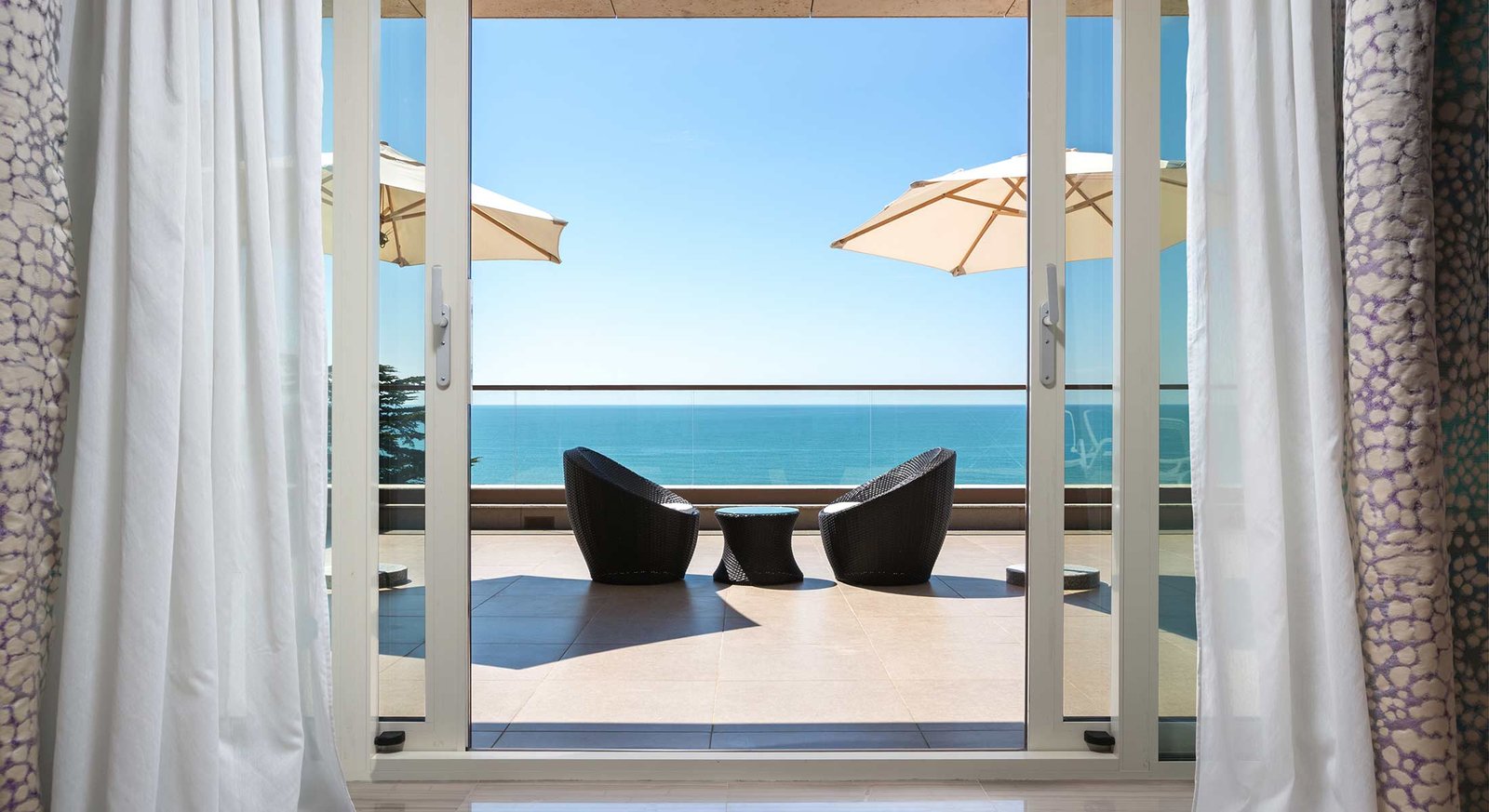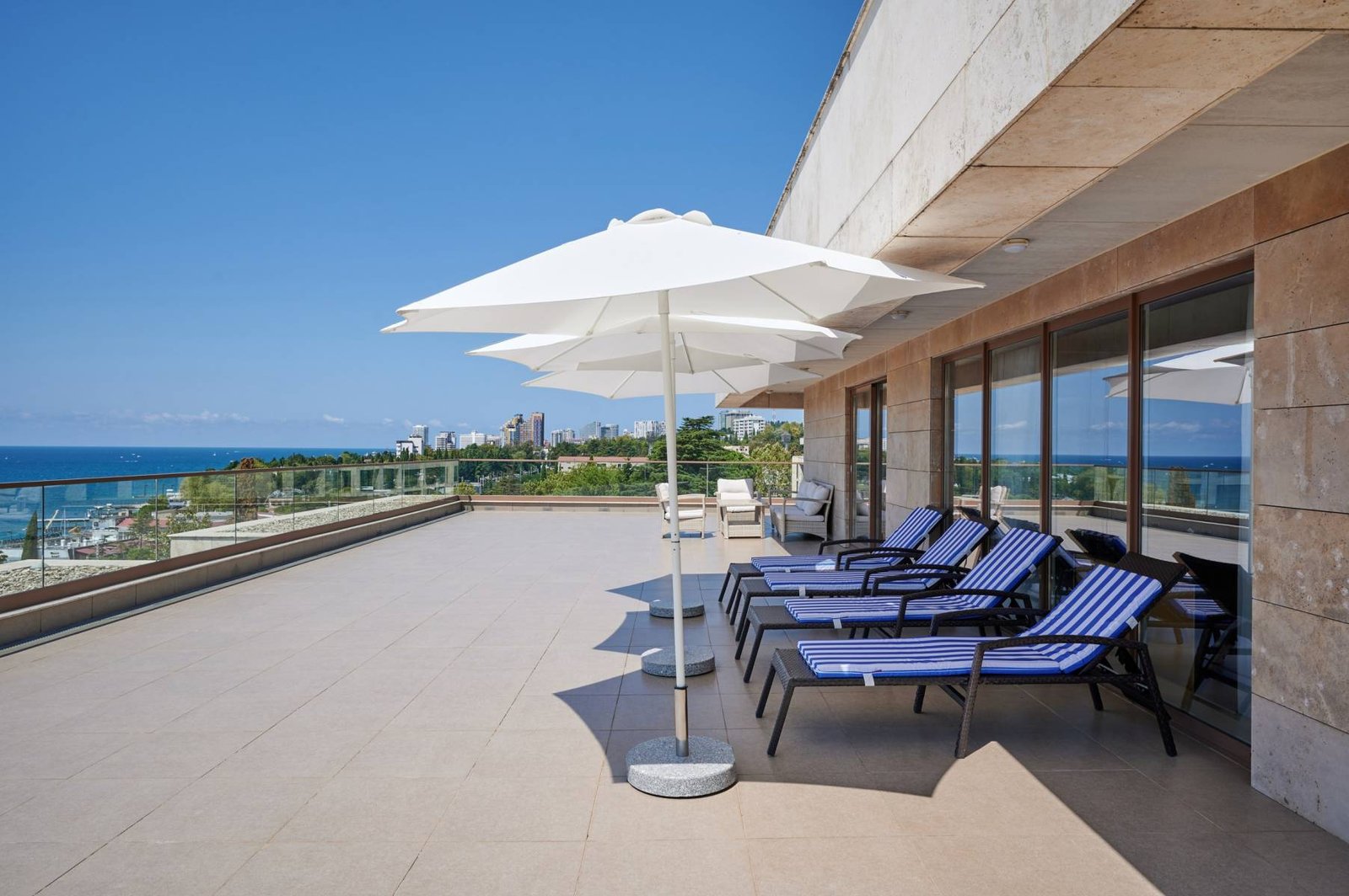 تقع أجنحة التيراس الفاخرة المطلة على البحر في الطوابق العليا من الجناحين الشرقي والغربي، وتمنح ضيوفها إطلالة خلابة على البحر الأسود وغروب الشمس الجنوبي والحديقة المزهرة. استمتع بأشعة الشمس الدافئة في أجواء من الخصوصية على التيراس الفسيح الخاص بك، حيث يلتقي الرفاهية بالهدوء في مشهد لا يُنسى.