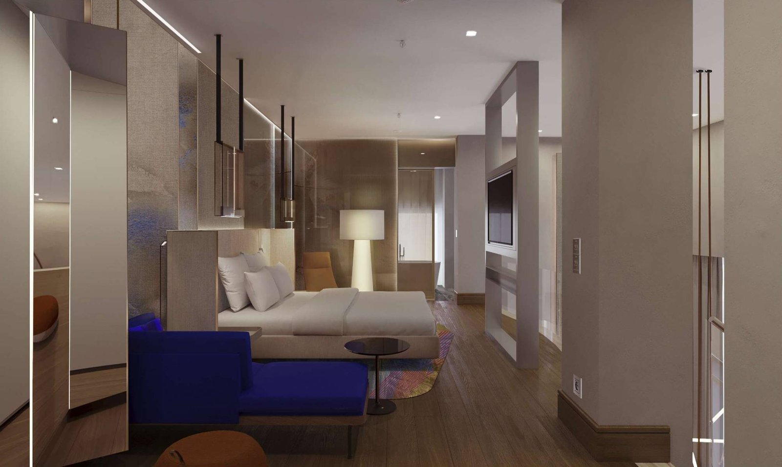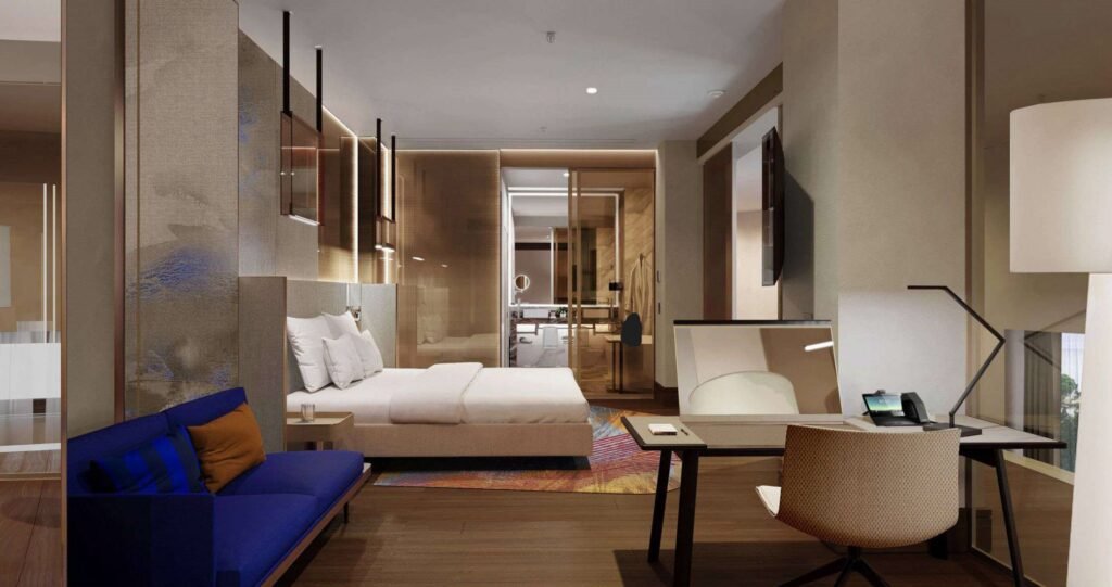 يضم الفندق 203 غرفة أنيقة مع شرفات وتراسات واسعة، تشمل 18 جناحًا فاخرًا بالإضافة إلى الجناح الرئاسي.