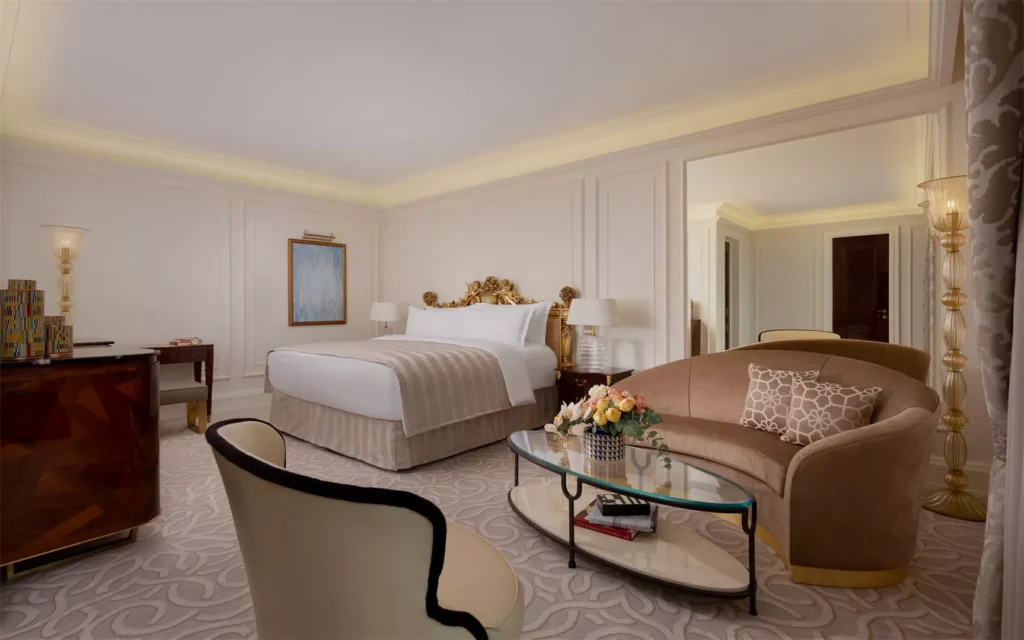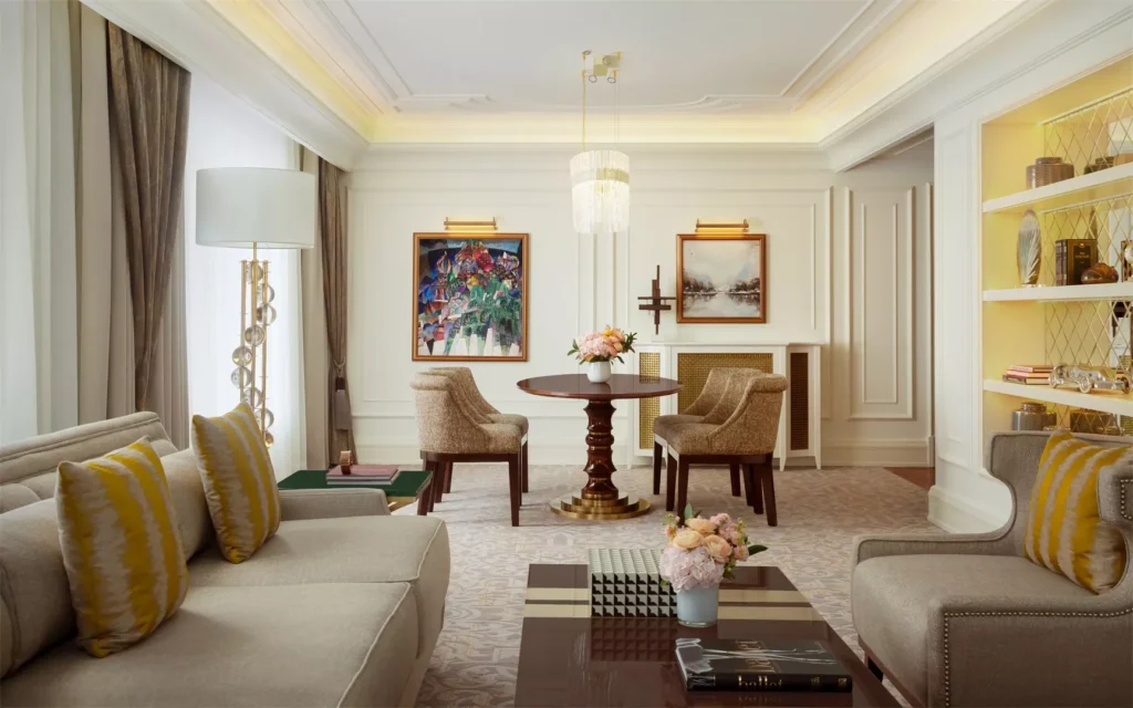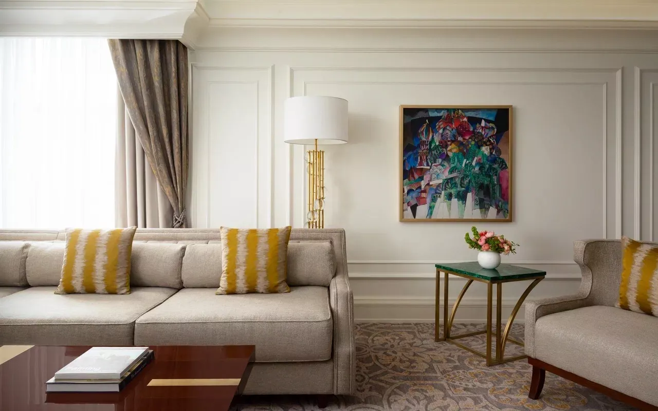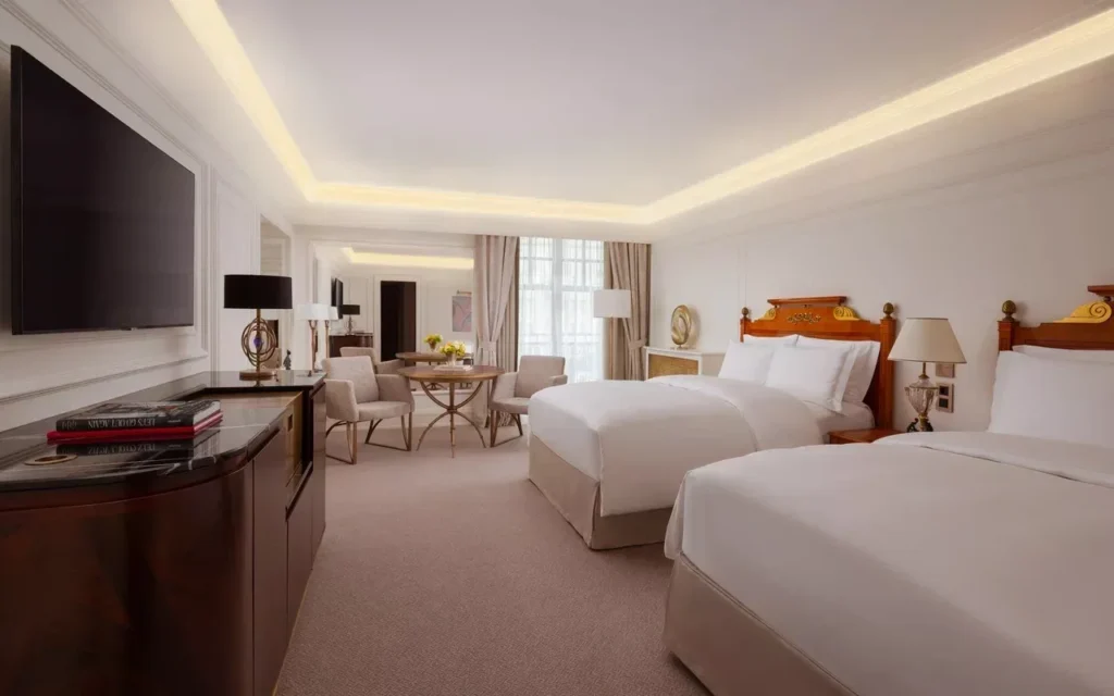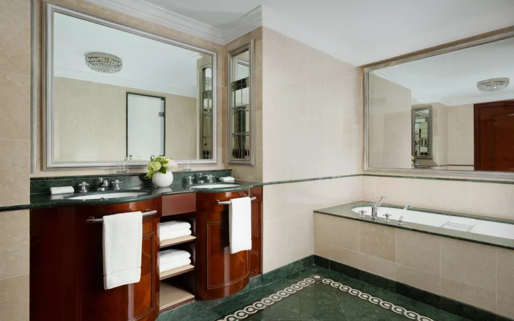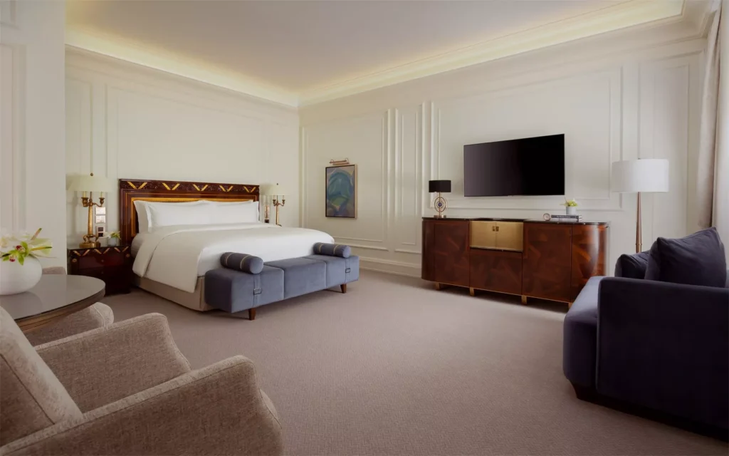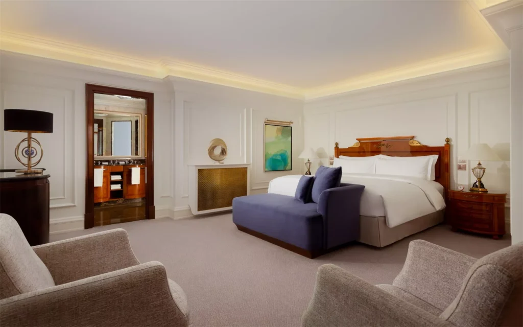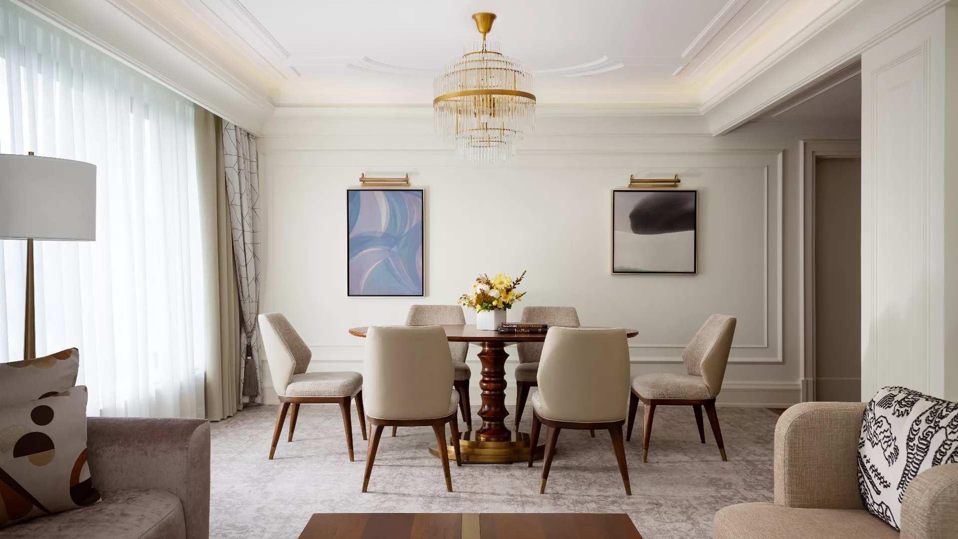 تُطل أجنحة كارلتون الركنية المكونة من غرفتين على وسط المدينة التاريخي، حيث يجتمع فيها الطابع الكلاسيكي بالفخامة الراقية. تضم غرفة المعيشة المنفصلة مساحة رحبة ومريحة للاسترخاء، تتزين بوسائد أنيقة وأرائك فخمة وكراسٍ مزدانة بتفاصيل راقية، بينما تضفي الطاولات الجانبية المرصعة بألواح من الرخام الأخضر لمسة من التميز. يربط السجاد المصمم خصيصًا بين جميع عناصر الغرفة بانسجام تام، وتُضفي القوالب المعمارية والزخارف طابعًا من الفخامة المترفة. أما الطاولة البيضاوية المزخرفة بتقنية الماركتري (التطعيم الخشبي) فتقف تحت ثريا كريستالية فاخرة تضفي أجواءً دافئة مثالية للجلسات الهادئة.