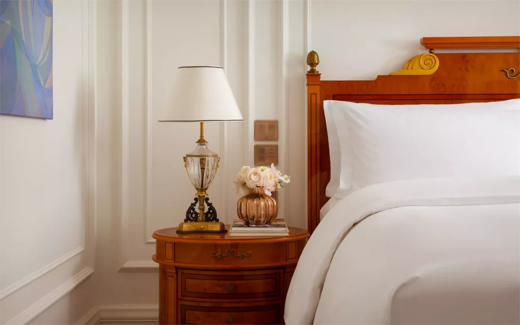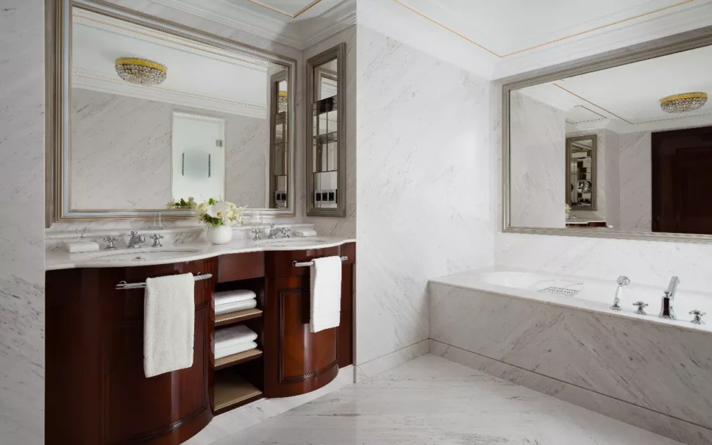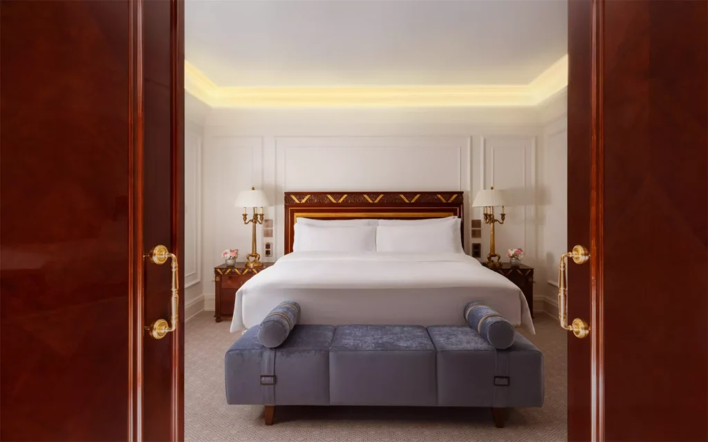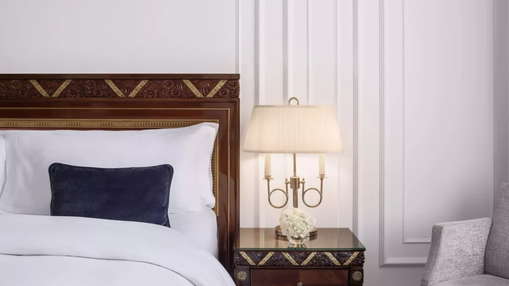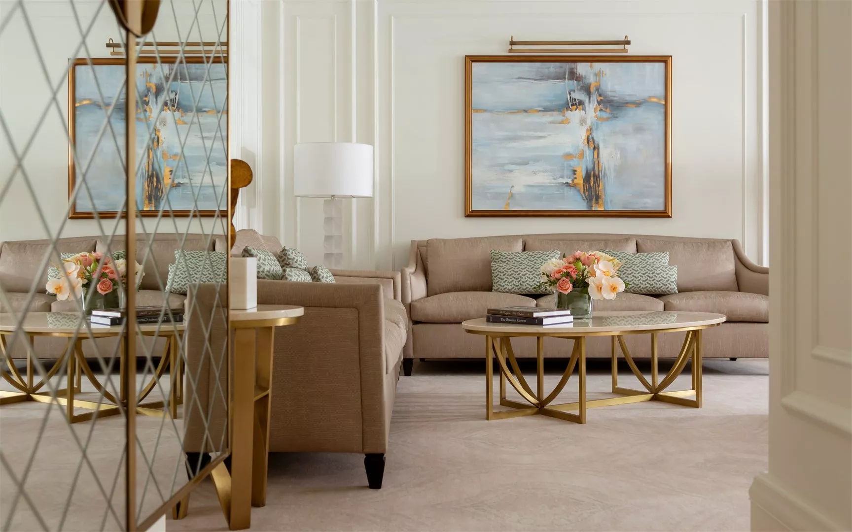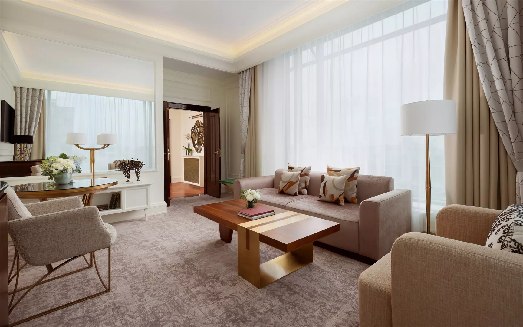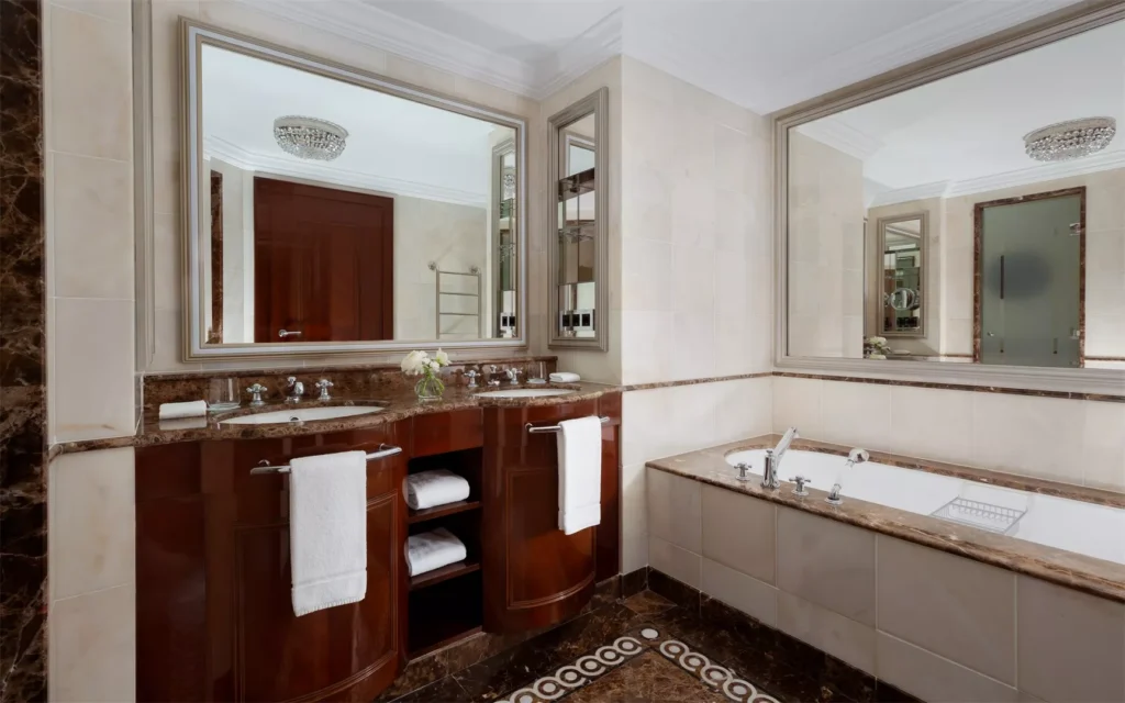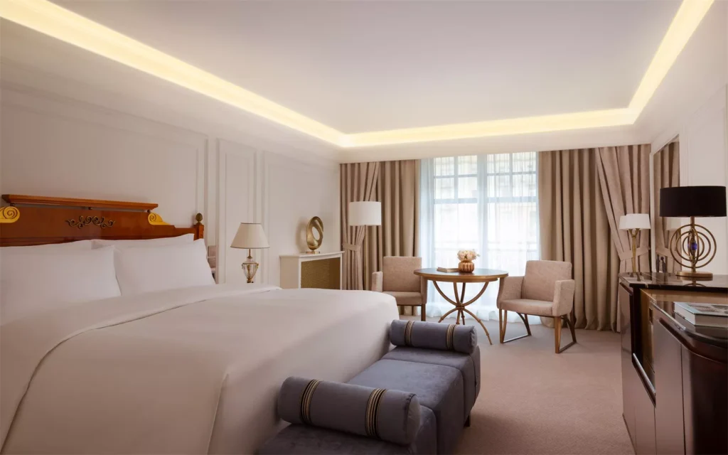 تُطل أجنحة كارلتون الركنية المكونة من غرفتين على وسط المدينة التاريخي، حيث يجتمع فيها الطابع الكلاسيكي بالفخامة الراقية. تضم غرفة المعيشة المنفصلة مساحة رحبة ومريحة للاسترخاء، تتزين بوسائد أنيقة وأرائك فخمة وكراسٍ مزدانة بتفاصيل راقية، بينما تضفي الطاولات الجانبية المرصعة بألواح من الرخام الأخضر لمسة من التميز. يربط السجاد المصمم خصيصًا بين جميع عناصر الغرفة بانسجام تام، وتُضفي القوالب المعمارية والزخارف طابعًا من الفخامة المترفة. أما الطاولة البيضاوية المزخرفة بتقنية الماركتري (التطعيم الخشبي) فتقف تحت ثريا كريستالية فاخرة تضفي أجواءً دافئة مثالية للجلسات الهادئة.