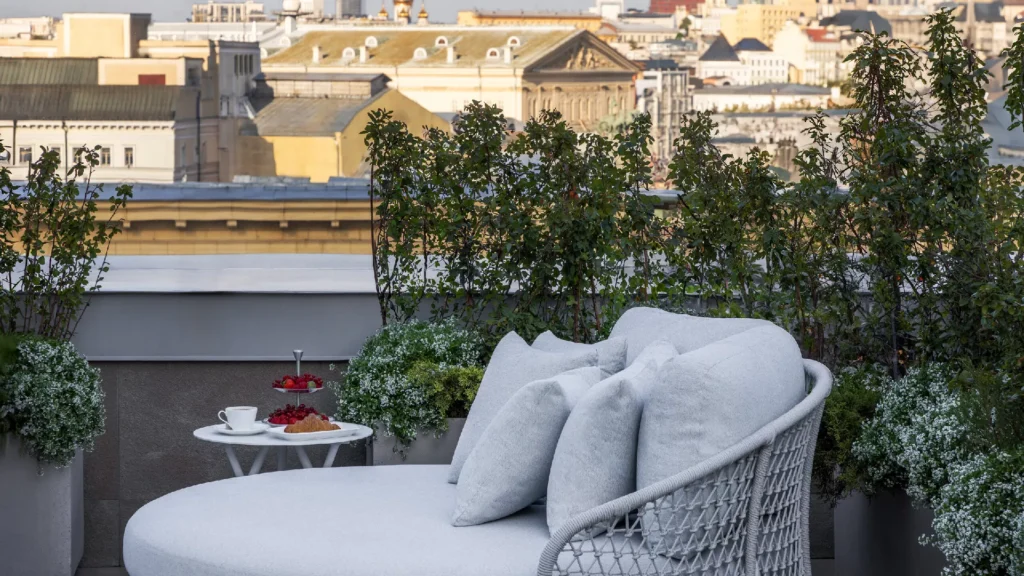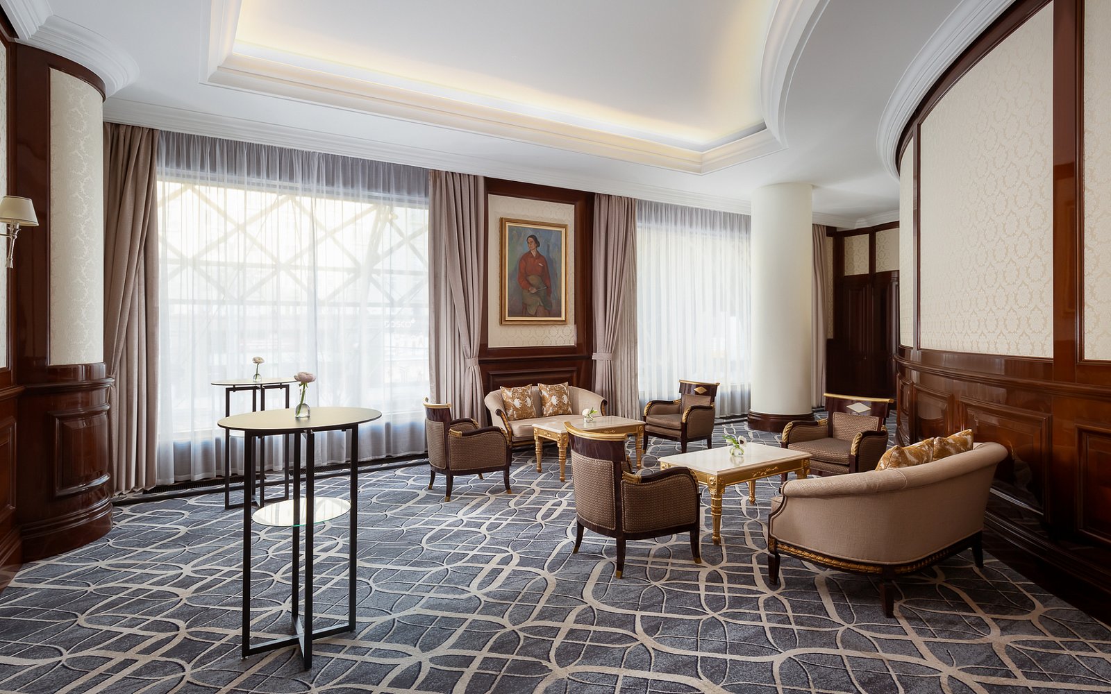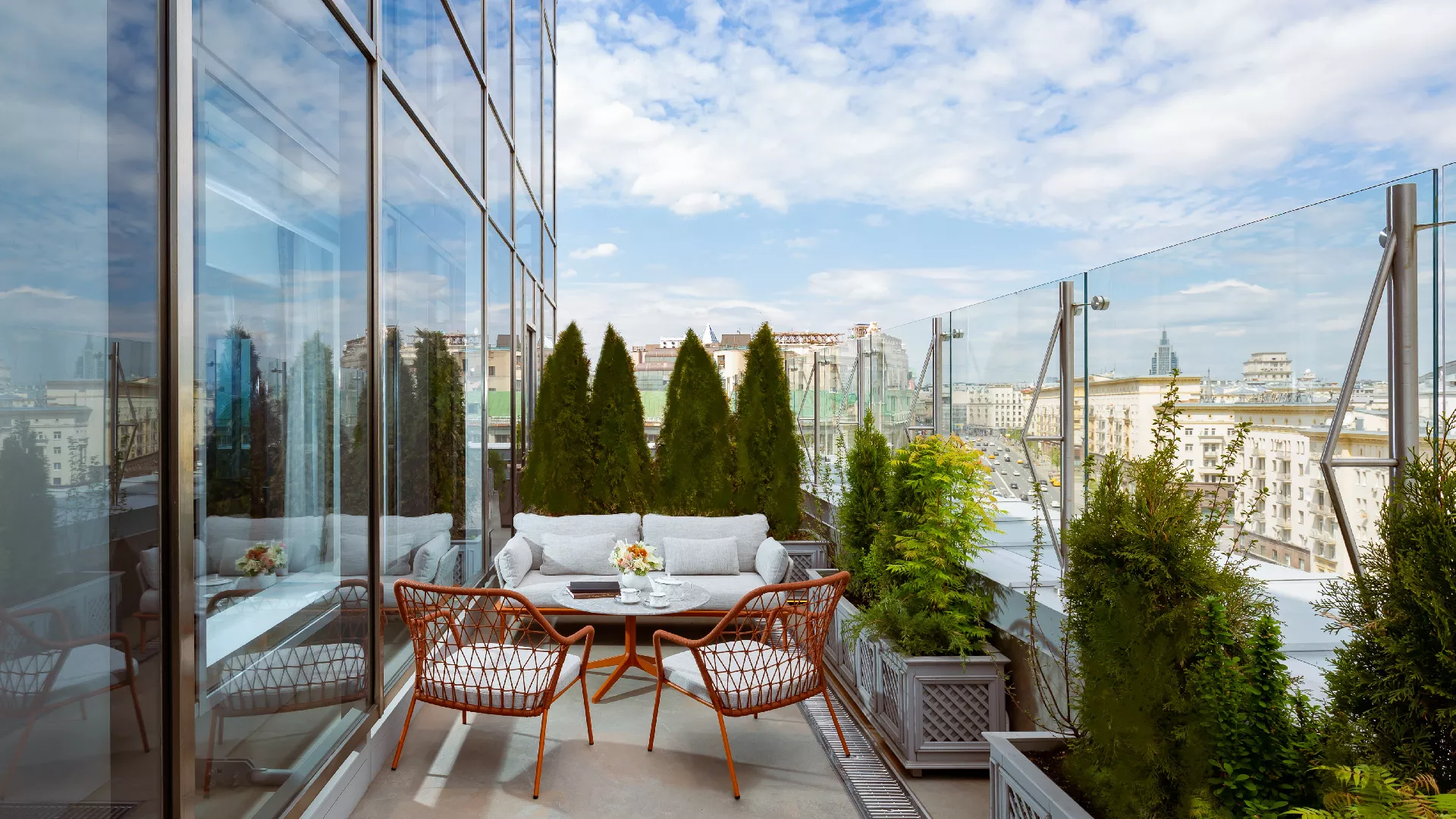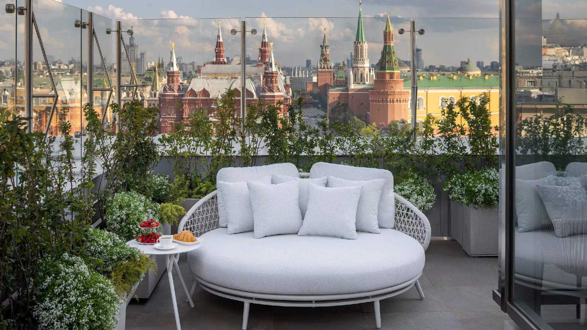 يمتد الجناح الرئاسي على مساحة تتجاوز 300 متر مربع ويضم تراسًا خاصًا يطل على مشاهد خلابة للعاصمة الروسية. يقع هذا الجناح الفخم في الطابق العاشر من الفندق، ويوفّر لضيوفه مستوى لا مثيل له من الراحة والفخامة. عند غروب الشمس، تنعكس الإضاءة الناعمة على التراس لتخلق أجواءً من السكينة والاسترخاء، بينما تتسلل أشعة المساء عبر النوافذ البانورامية لتكشف عن منظرٍ ساحرٍ للمدينة.