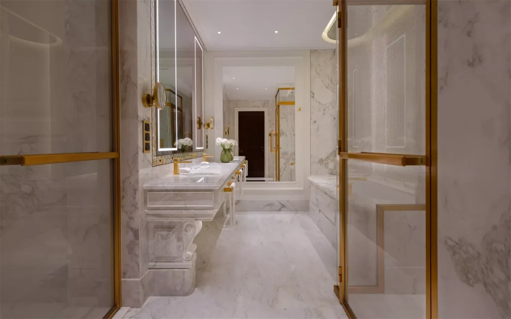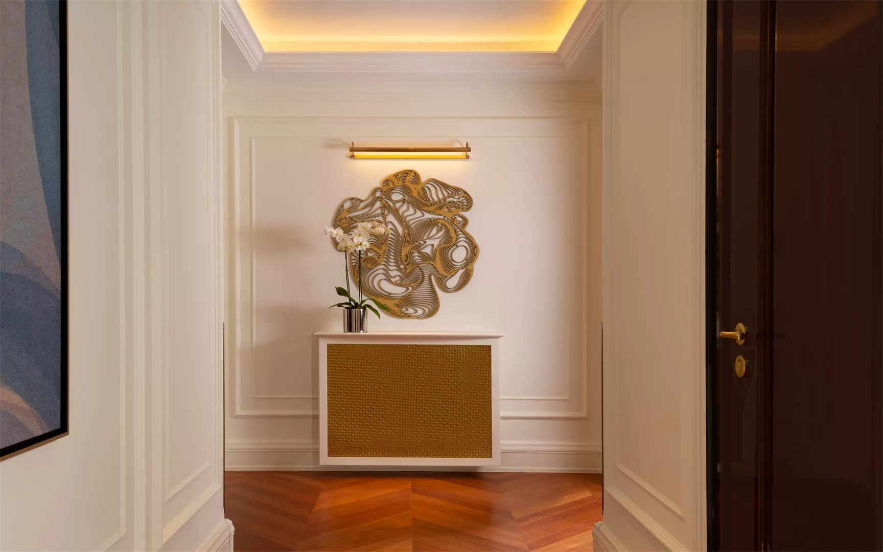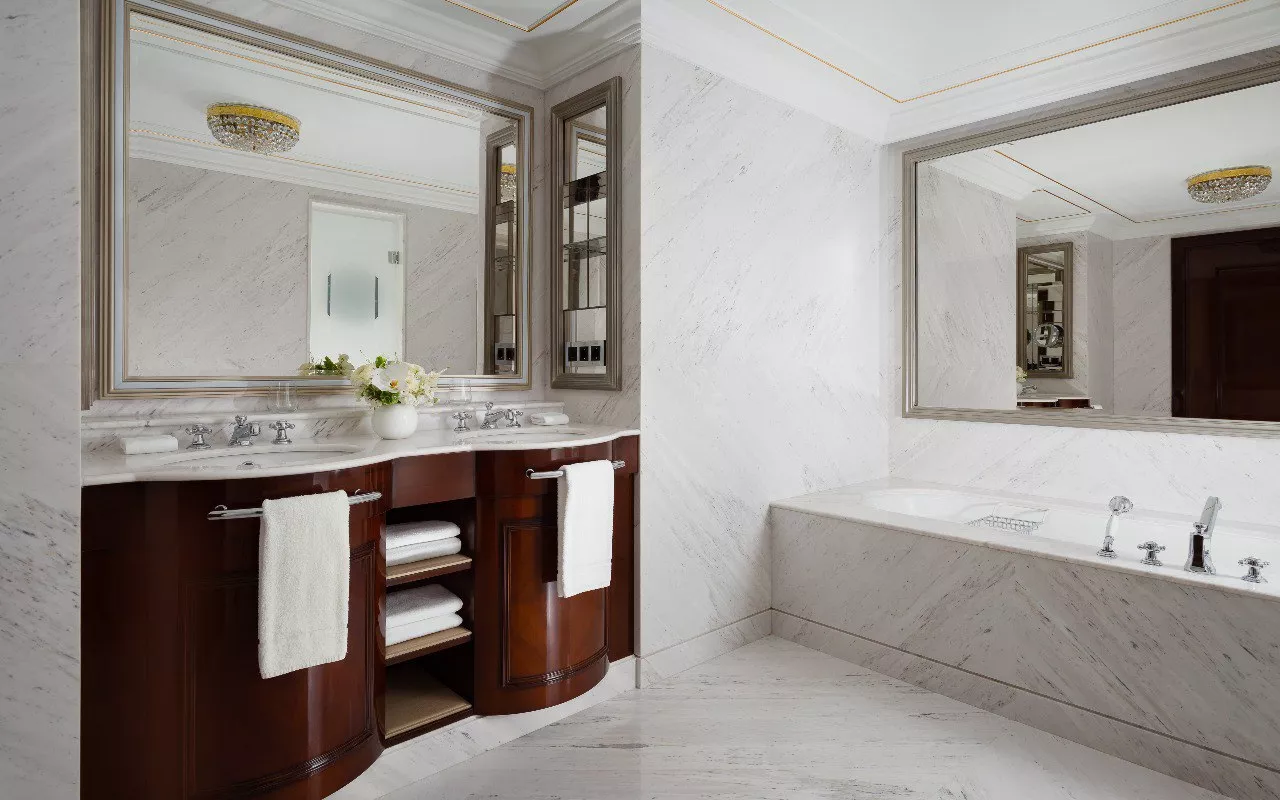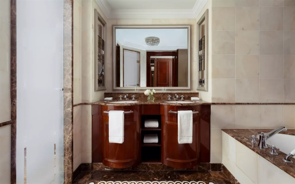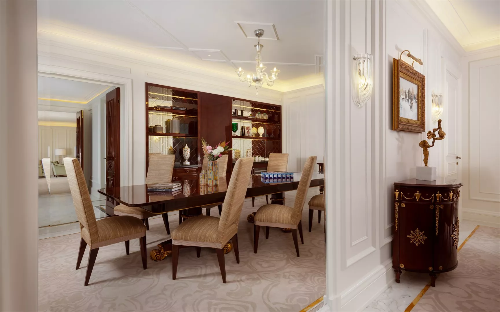 استمتع بإطلالاتٍ مبهرة على الكرملين وكل ما يقدّمه فندق ذا كارلتون، موسكو من رفاهية استثنائية في هذا الجناح الفخم الذي يجسّد ذروة الأناقة والفخامة. يبدأ استقبال الضيوف في ردهةٍ دائرية مذهلة تتدلّى من سقفها ثريا أنيقة تنعكس أضواؤها على أرضية الرخام اللامعة، في مشهدٍ يوحي بعراقة القصور الروسية. من هنا تنطلق رحلتك عبر الجناح، الذي يمتدّ على مساحة تتجاوز 300 متر مربع. يؤدي أحد الأبواب إلى صالة رياضية خاصة مجهّزة بأحدث الأجهزة، بينما يقود آخر إلى مكتب فخم، مطبخ خاص، وغرفة طعام راقية يمكن استخدامها للاجتماعات أو المآدب الخاصة.