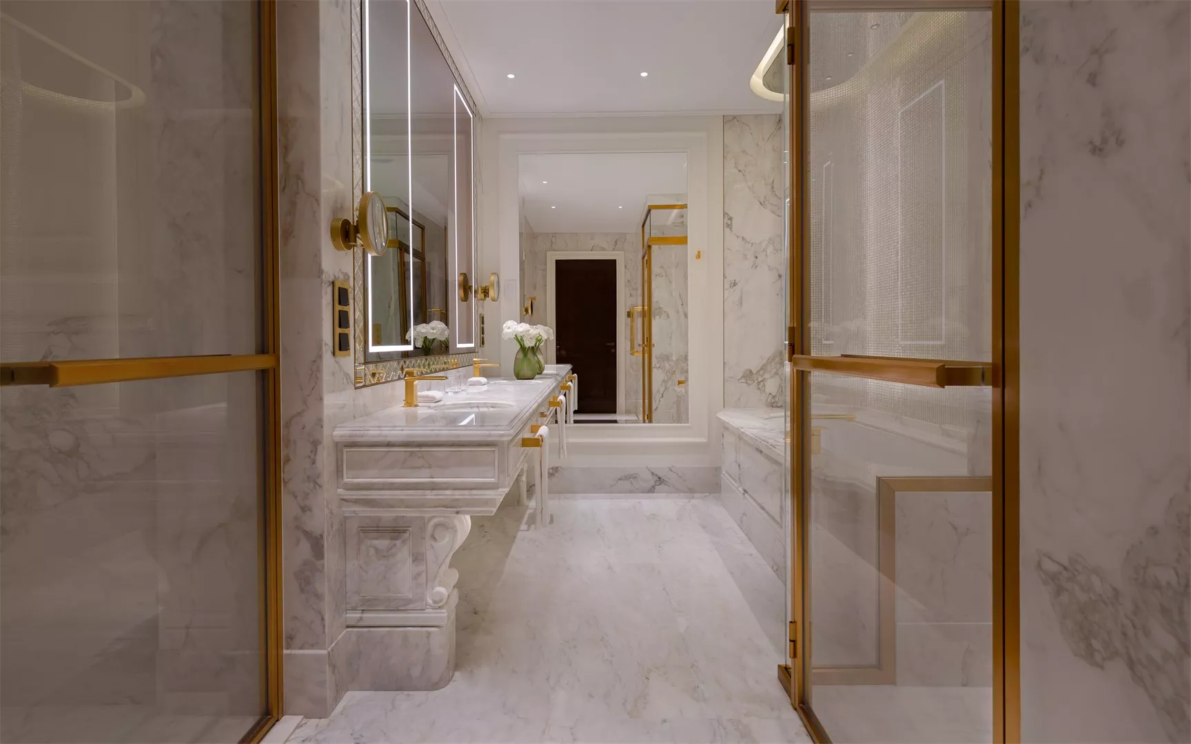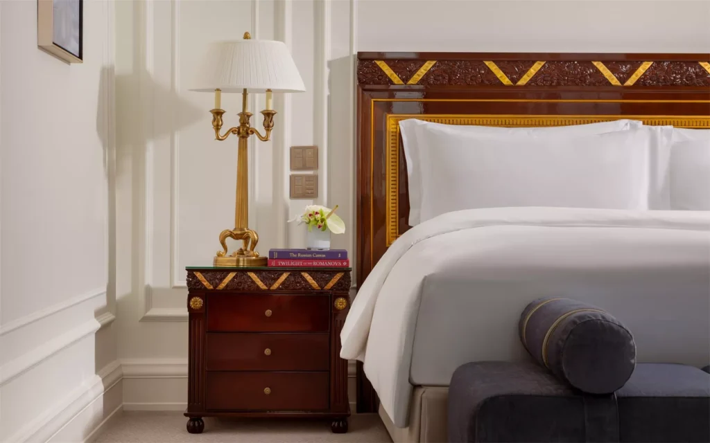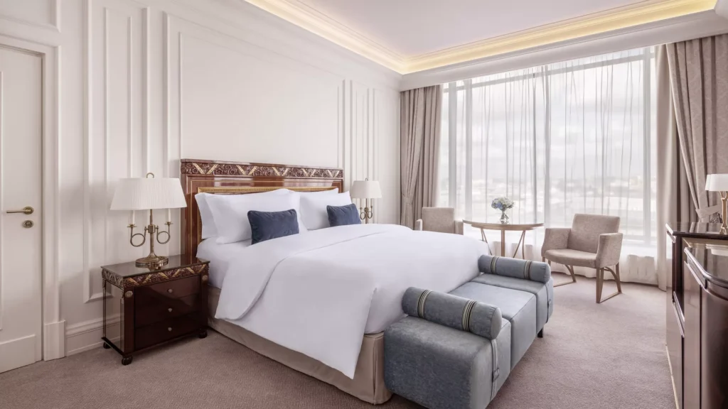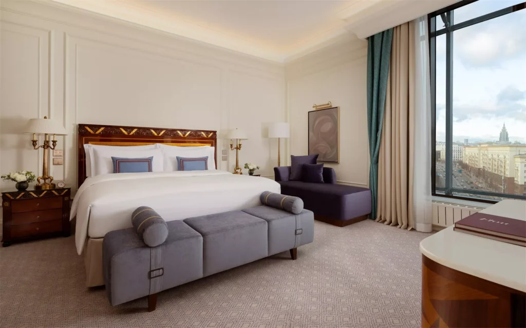 يتمتع الجناح بموقع زاوي مميز في الطابق الثامن أو التاسع، حيث تكشف النوافذ البانورامية عن إطلالات خلابة على مركز موسكو التاريخي. أما غرفة النوم الأنيقة، المصممة خصيصًا بمفروشات فريدة، فتؤدي إلى غرفة ملابس رحبة توفر أقصى درجات الراحة والتنظيم. ويُكمل المشهد الحمّام الفاخر المكسو بالرخام النبيل والمزود بمرايا واسعة وإضاءة مدروسة تمنح المكان إحساسًا بالاتساع والهدوء.