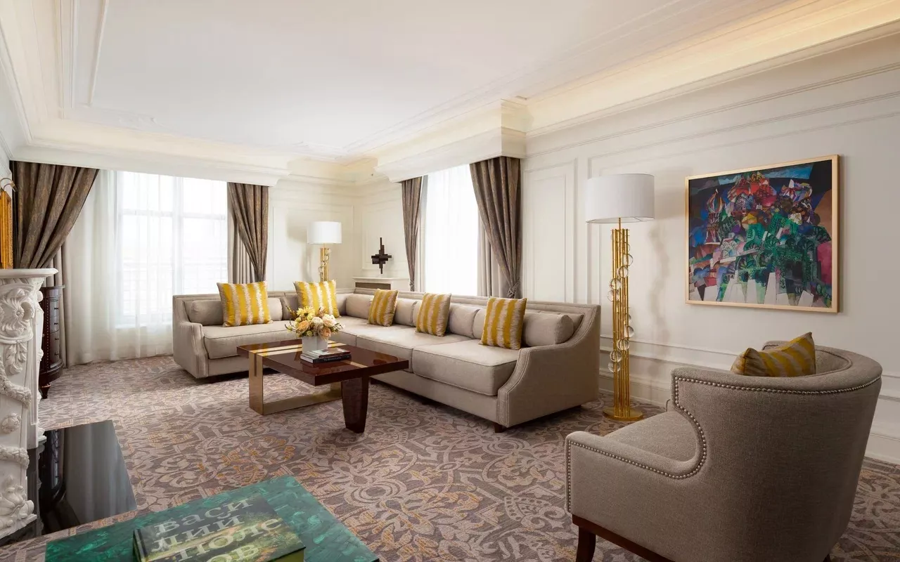 تُطل أجنحة كارلتون الركنية المكونة من غرفتين على قلب موسكو التاريخي، وتمنح الضيوف إطلالات خلابة على أبراج الكرملين الشهيرة. صممت غرفة المعيشة المنفصلة بعناية لتوفر أقصى درجات الراحة والاسترخاء، حيث تضم منطقة جلوس فسيحة بأريكة كبيرة وكراسٍ مريحة مزينة بوسائد أنيقة بألوان راقية. تضيف الطاولات الجانبية المصنوعة من الرخام الأخضر المصقول لمسة من الفخامة، بينما يجمع السجاد المصمم خصيصًا عناصر الغرفة بتناغم وانسجام.