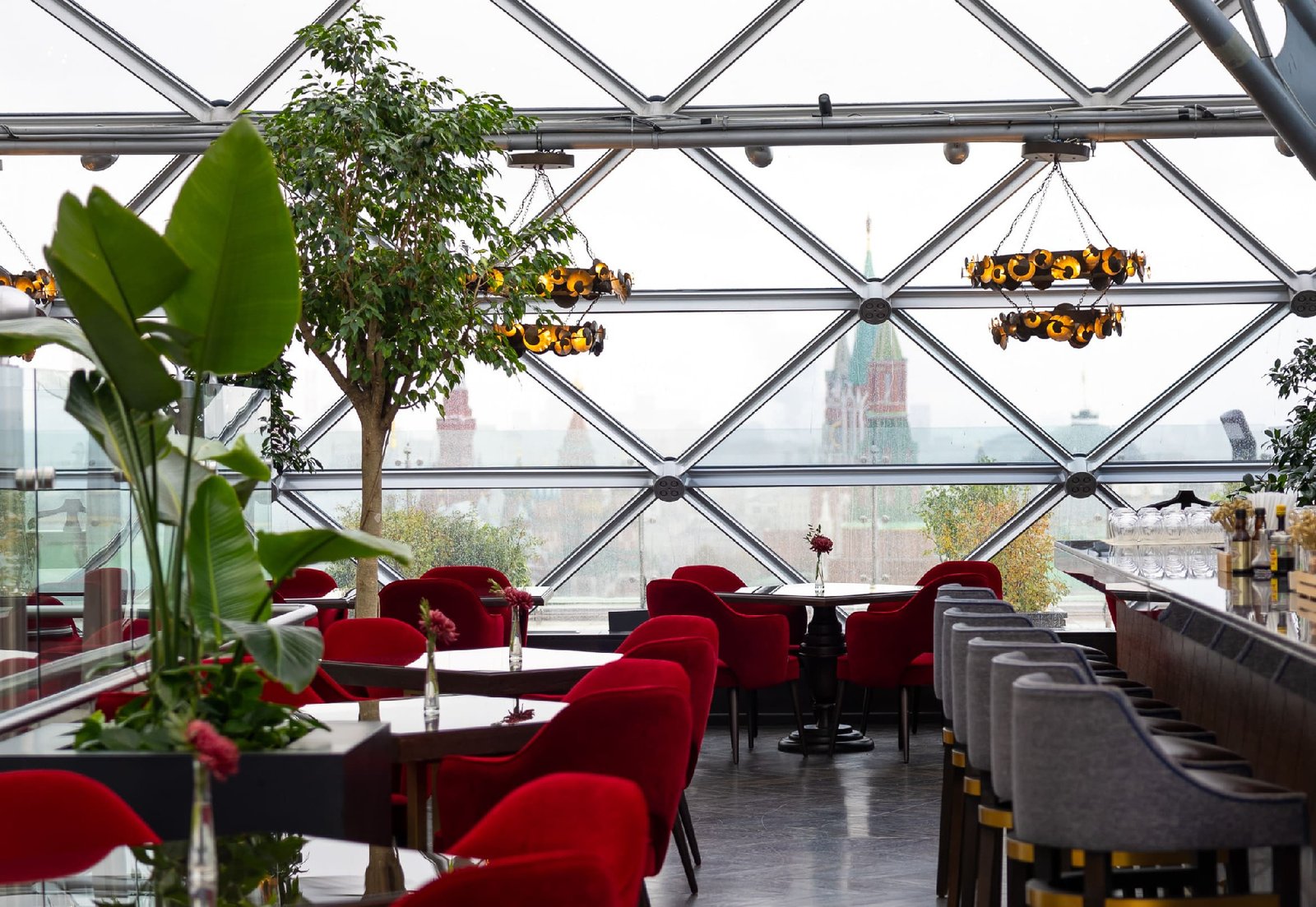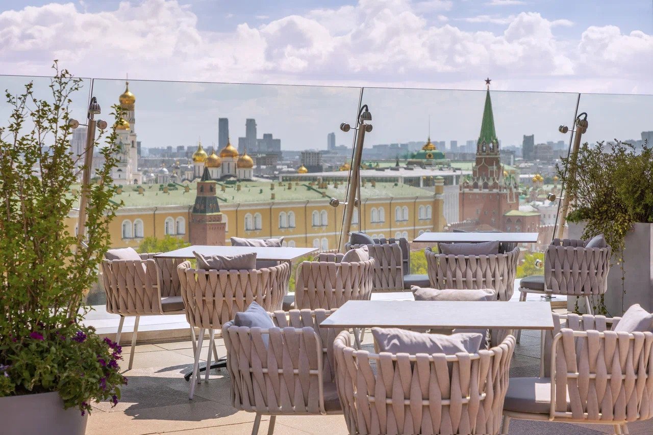 مطعم O2 – مطعم السطح الأيقوني للفندق مع تراس بانورامي يطل على الميدان الأحمر والكرملين.