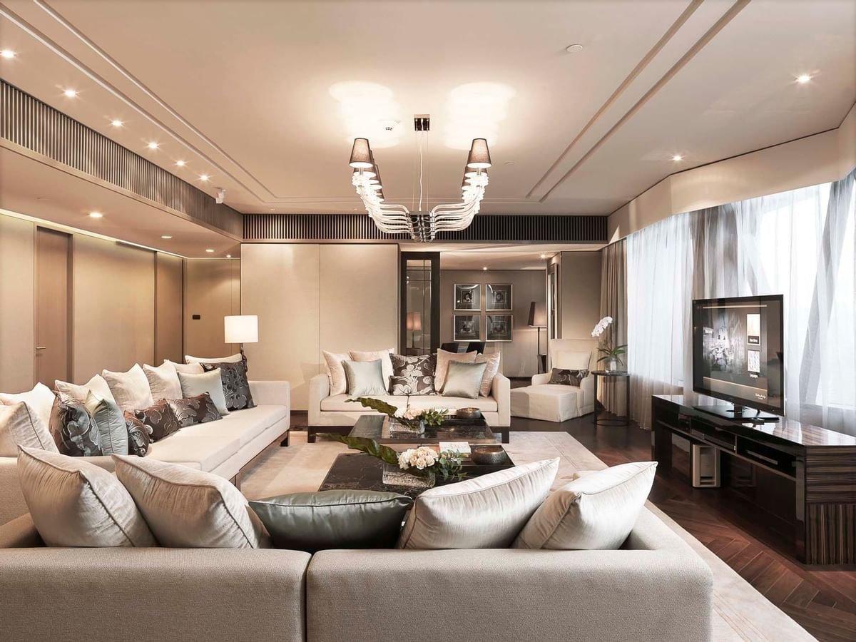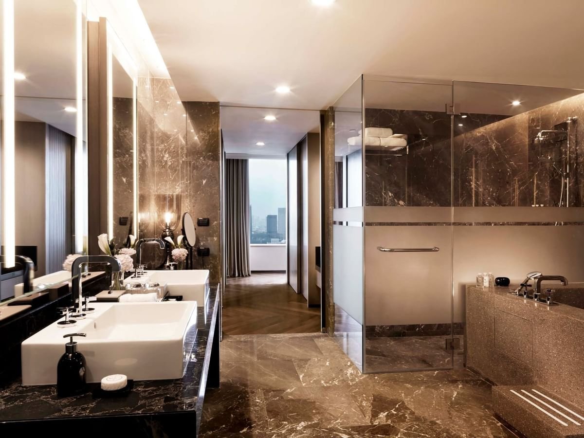 يمتد الجناح الرئاسي على مساحة 156 مترًا مربعًا، ويتميز بتصميم فني رفيع المستوى يعكس جودة استثنائية في التفاصيل والتشطيبات. يفصل المدخل بين غرفة النوم الرئيسية المُجهَّزة بعناية فائقة ومنطقة المعيشة الأنيقة والواسعة التي تطل على أفق مدينة بانكوك.