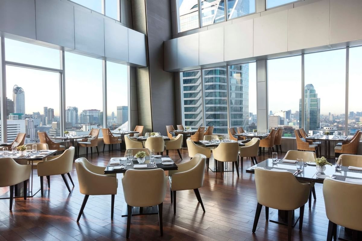 يمكن للضيوف الاستمتاع بإطلالات خلابة على وسط بانكوك من الشرفة الخارجية المعلّقة قبل الاستمتاع بوجبة فاخرة في قاعة الطعام التي تضم مطبخاً مفتوحاً يضفي أجواءً من الحرفية والابتكار.