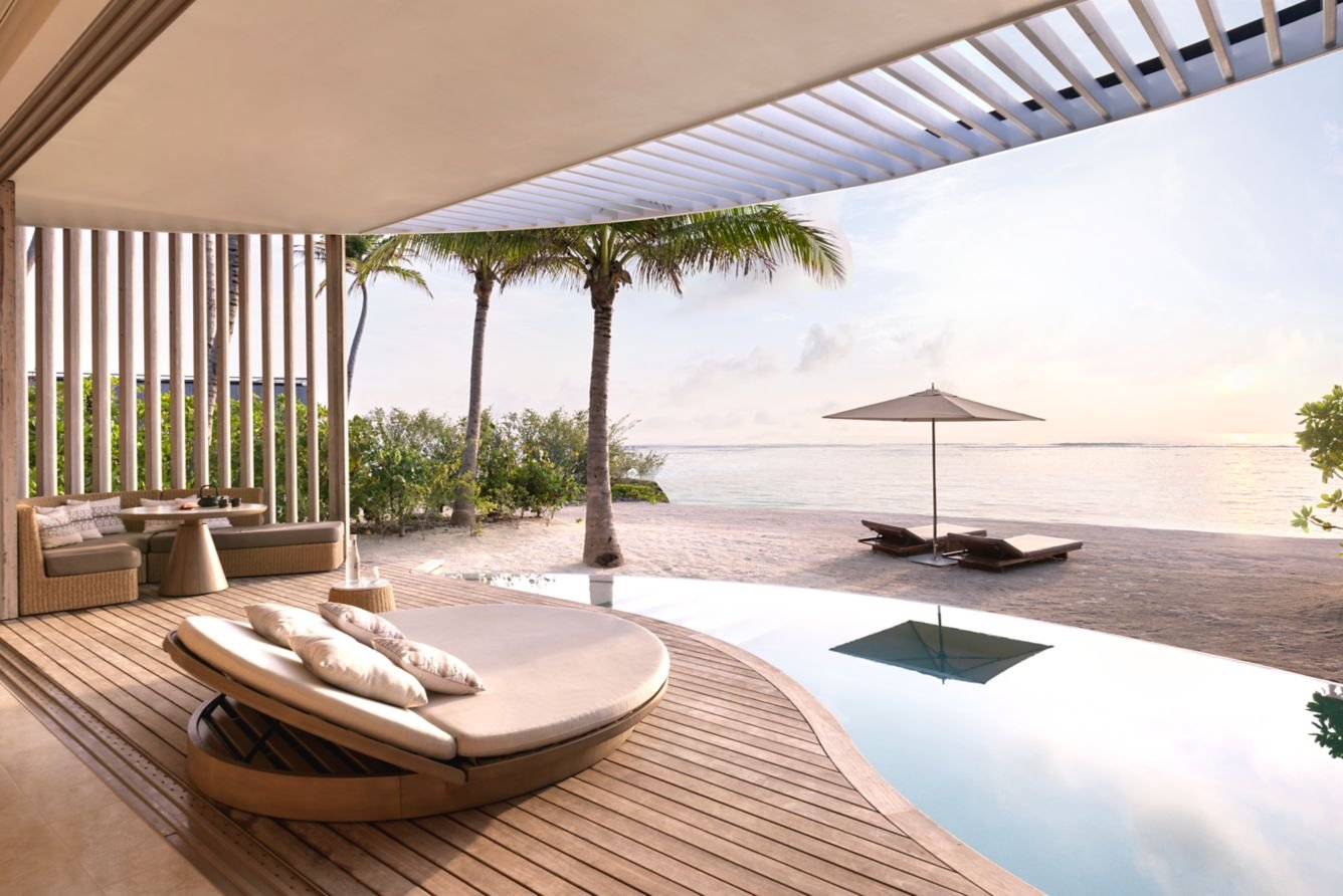 فيلا شاطئية فاخرة بمساحة 400 متر²، تحتوي على غرفتين نوم (غرفة رئيسية بسرير كينغ وغرفة ثانية بسريرين مزدوجين) وأريكة قابلة للتحويل، مع حوض سباحة خاص على الباحة (39 متر²) وجاكوزي داخل الغرفة. الفيلا توفر غرفة معيشة منفصلة، منطقة طعام واسعة، ومساحة خارجية للتمتع بإطلالات الشاطئ عند الغروب.