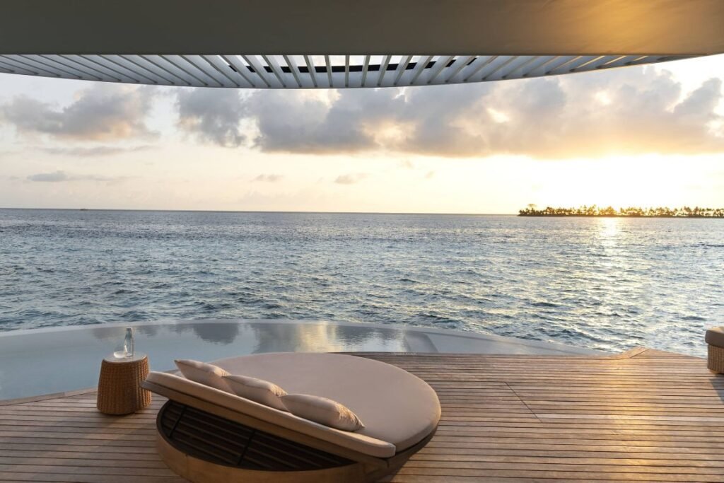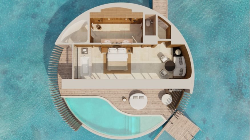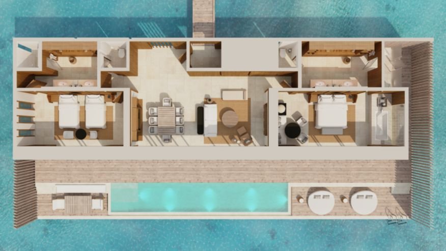 فيلا فاخرة فوق الماء بمساحة 350 متر²، تحتوي على غرفتين نوم (غرفة رئيسية بسرير كينغ وغرفة ثانية بسريرين مزدوجين)، أريكة قابلة للتحويل، مع حوض سباحة خاص على الباحة وجاكوزي داخل الغرفة. الفيلا توفر مساحة واسعة للمعيشة والطعام وإطلالات بانورامية مذهلة على المحيط.