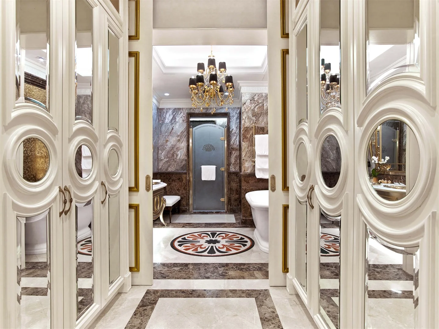 يجسد الجناح الرئاسي في فندق سانت ريجيس أرقى مستويات الفخامة والتفرد، ويعكس إرث مؤسسي هذه العلامة الفندقية المرموقة. لقد أصبح هذا الجناح بطاقة تعريفية للفندق، حيث يلتقي فيه الترف والأناقة في كل تفاصيل التصميم. يتميز التصميم الداخلي باستخدام درجات الذهب والأبيض والبيج، مع توظيف أفخر المواد مثل خشب البلوط المطلي بالذهب، الرخام، الكريستال، والحرير. كل هذه العناصر تخلق أجواءً فريدة من الأناقة والفخامة تحيط بالضيوف منذ اللحظة الأولى لدخولهم الجناح.