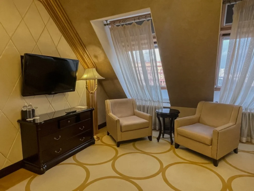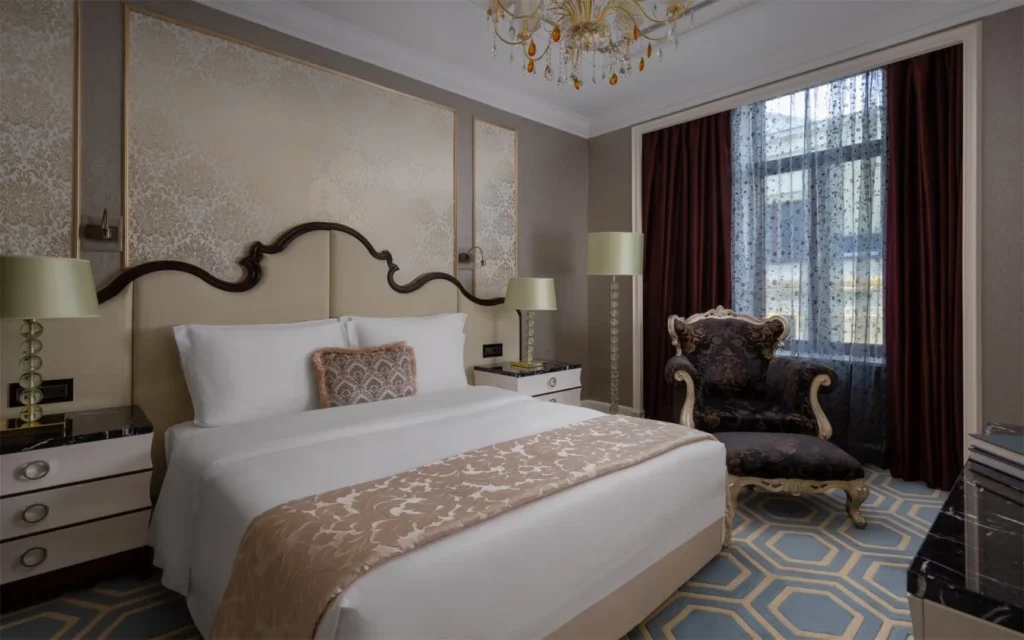 تجمع غرفة ديلوكس المزودة بسرير كينغ بين الأناقة والراحة في تجربة إقامة فاخرة ومميزة. يمنح الارتفاع الاستثنائي للأسقف الذي يصل إلى ثلاثة أمتار، وفي بعض الغرف إلى خمسة أمتار، مع النوافذ الكبيرة، الغرفة طابعًا فريدًا من الرحابة والجمال، مما يخلق تناغمًا رائعًا بين المساحة والتصميم.